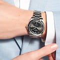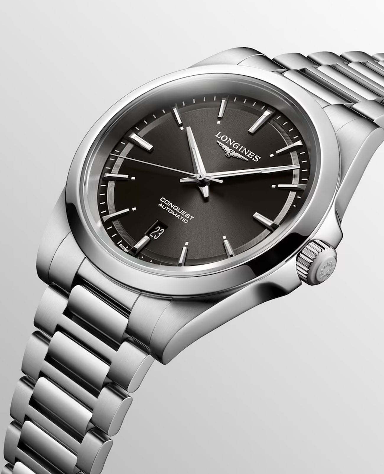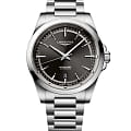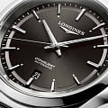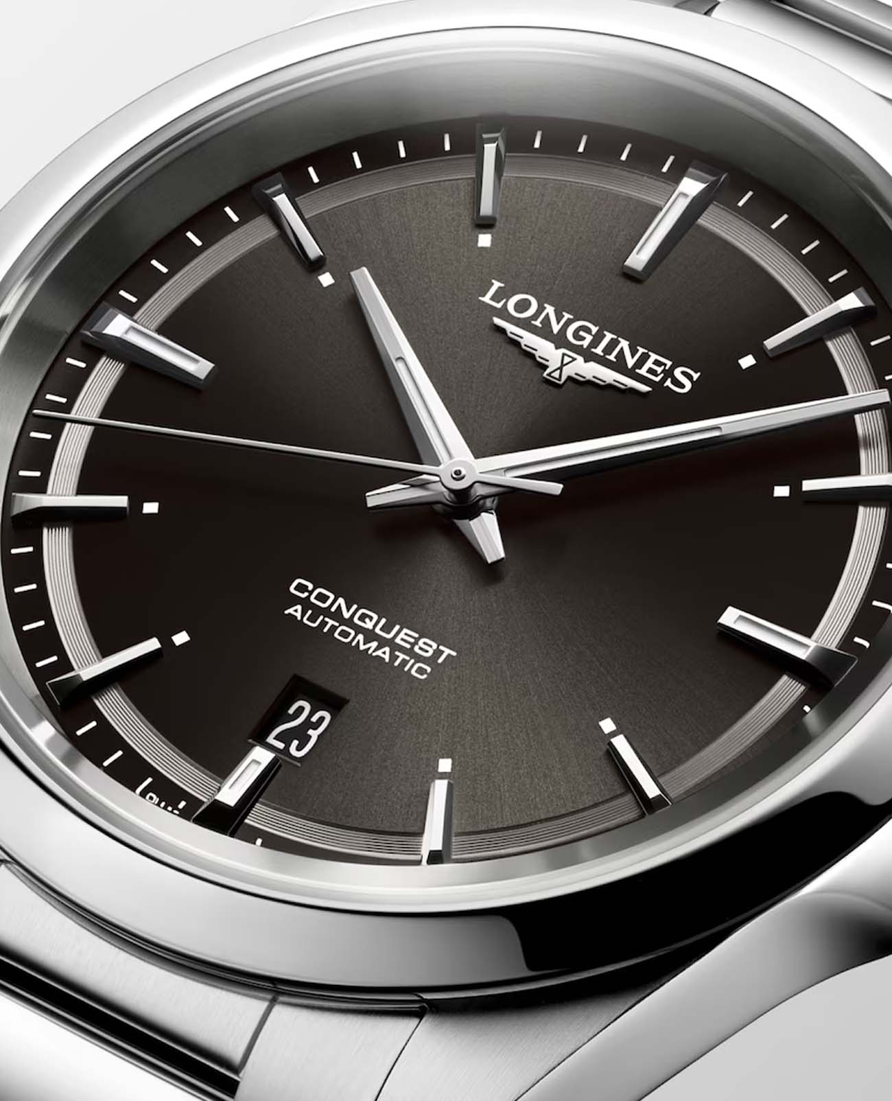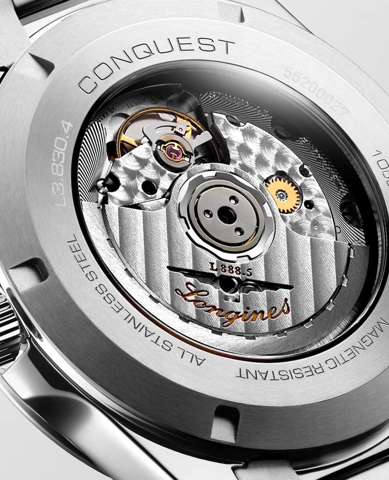 Longines Conquest Automatic (L3.830.4.52.6) — элегантные швейцарские часы, сочетающие классический дизайн и современные технологии. Корпус выполнен из нержавеющей стали диаметром 41 мм, придающим модели прочность и долговечность. Сапфировое стеклоСапфировое стеклоПрочный и надёжный материал из кристалла сапфира синтетического происхождения, характеризующийся особой твёрдостью и устойчивостью к царапинам и повреждениям. с антибликовым покрытиемАнтибликовое покрытиеСлой оксида металла в 0,13-0,3 микрон, благодаря которому стекло часов не бликует и не отражает свет. Антибликовое покрытие уменьшает отражение света в 10 раз, обеспечивая отличную читаемость показателей циферблата. защищает циферблат от царапин и гарантирует превосходную читаемость.Чёрный циферблат с солнечным узором оснащён серебристыми стрелками и метками с люминесцентным покрытиемЛюминесцентное покрытиеПозволяет считывать показания времени в темноте. Производители наносят на стрелки, часовые индексы, безель или поверхность циферблата светонакопительный состав, дающий холодное свечение. Super-LumiNova, обеспечивающим отличную видимость в условиях низкой освещённости. Механизм L888 с 72-часовым запасом хода обеспечивает высокую точность и надёжность. Браслет из нержавеющей стали на застёжке-бабочке с кнопкамиЗастёжка "бабочка"Такой вид застёжки дополняется предохранителями, помогающими избежать случайного раскрытия браслета. Обладают изящным исполнением. и предохранителем гарантирует комфорт и надёжную фиксацию на запястье. Функциональность дополняется индикатором даты в положении "6 часов". Водонепроницаемость 100 метров делает модель подходящей для плавания и других водных активностей.