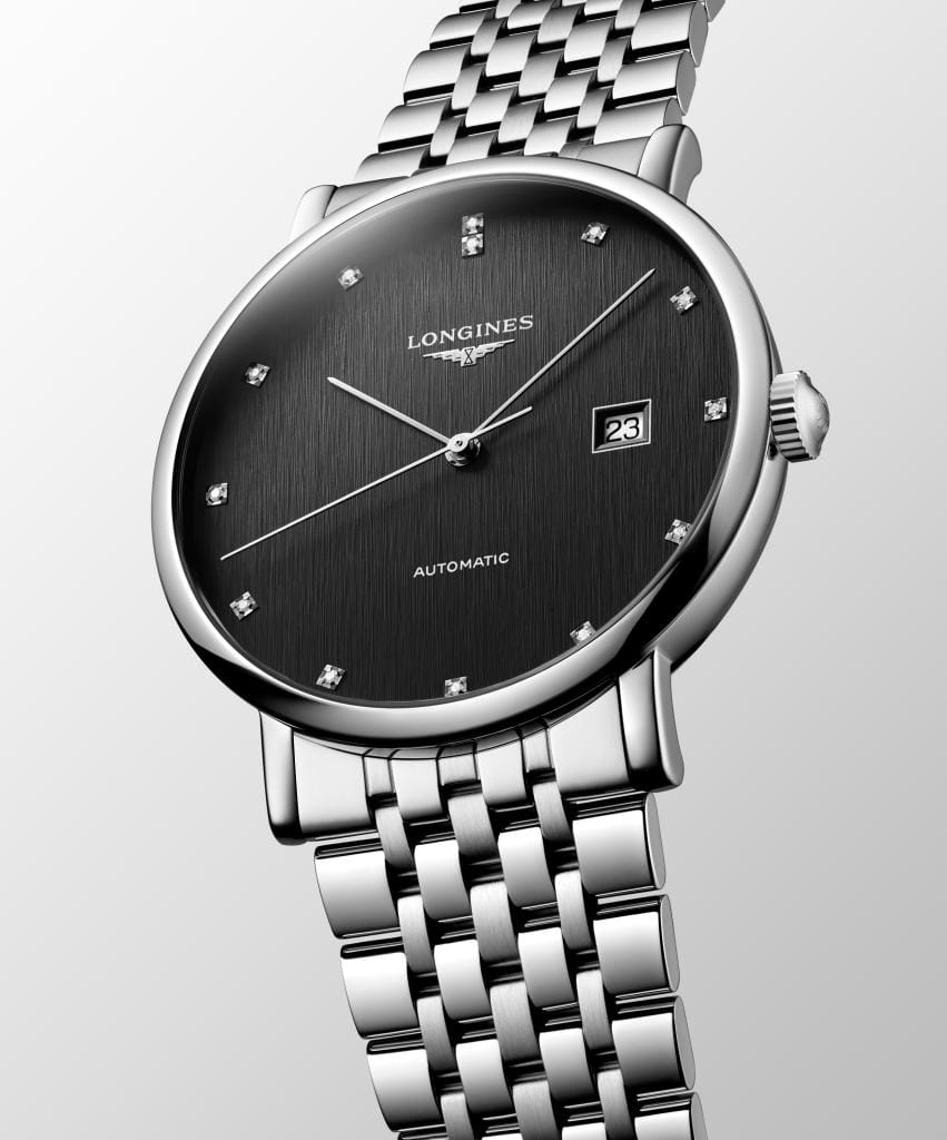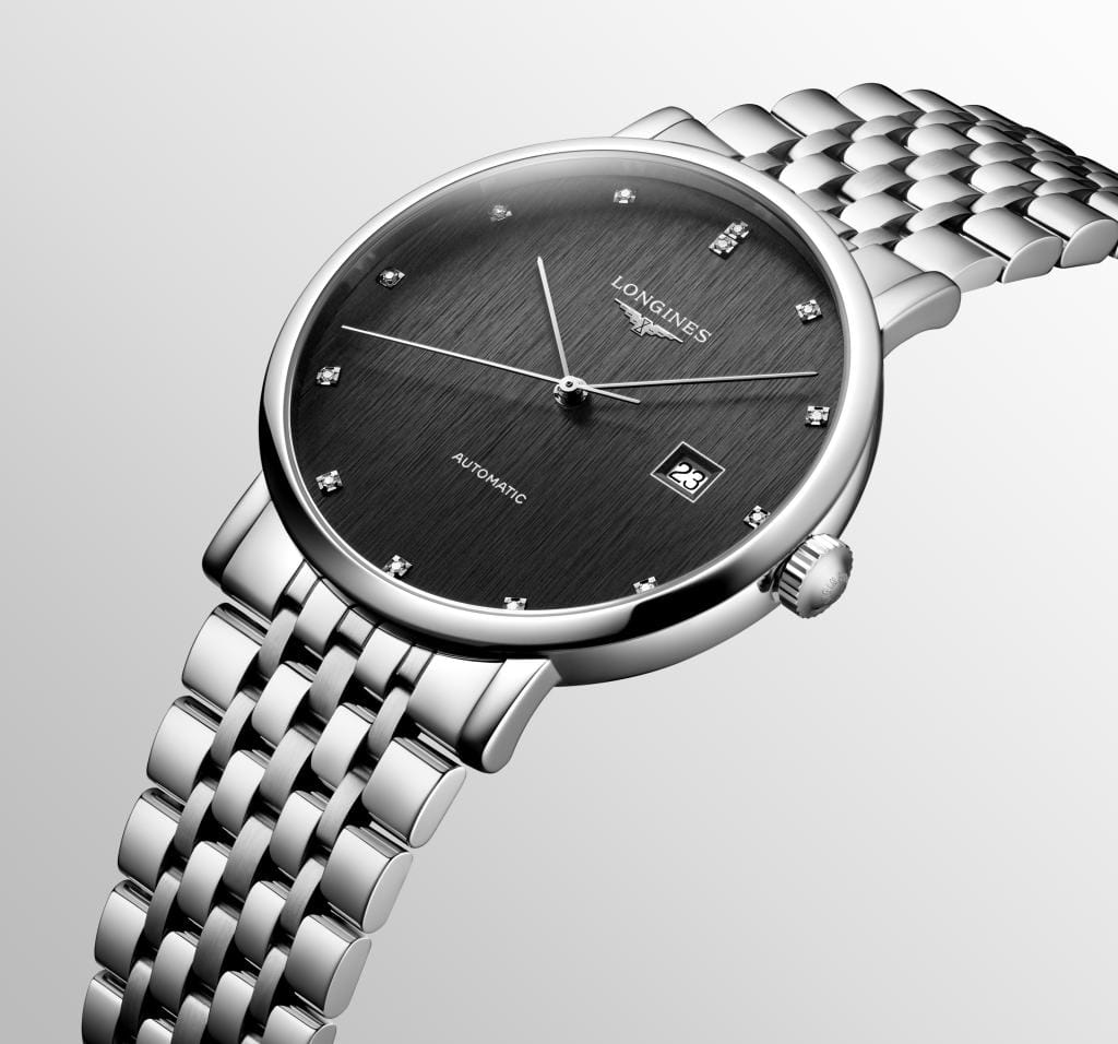 Мужские швейцарские механические часы с автоподзаводом Longines Elegant Collection L4.911.4.78.6. Сапфировое стеклоСапфировое стеклоПрочный и надёжный материал из кристалла сапфира синтетического происхождения, характеризующийся особой твёрдостью и устойчивостью к царапинам и повреждениям. устойчивое к появлению царапин, обладающее высокой прозрачностью. Корпус изготовлен из нержавещей стали. Циферблат украшен 13 бриллиантами группы Top Wesselton VS-SI общим весом 0.037 карата. Окошко даты находится в положении 3 часа. Класс водозащиты: 30 метров, позволит защитить корпус от случайных брызг или капель дождя. Браслет из нержавеющей стали на застёжке-бабочке с кнопкамиЗастёжка "бабочка"Такой вид застёжки дополняется предохранителями, помогающими избежать случайного раскрытия браслета. Обладают изящным исполнением. .