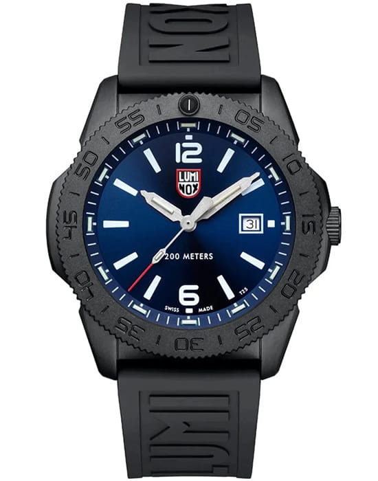 Luminox XS.3123.B — мужская модель серии Pacific Diver, сочетающая надёжность дайверских часов и современный стиль. Корпус диаметром 44 мм выполнен из нержавеющей стали с чёрным PVDPVDУльтратонкое покрытие наносится в технике вакуумного напыления, сочетает в себе нитрид титана особой прочности со слоем золота или оксида хрома. Несёт в себе декоративную или защитную функцию.-покрытием, а односторонний вращающийся безельБезельВнешний ободок, закрепляющий стекло. В спортивных часах так называется поворотное кольцо с делениями на циферблате, выполняет роль таймера – замеряет отрезки времени на шкале. Неподвижный безель – элемент декора. Однонаправленно вращающийся безель на дайверских часах позволяет фиксировать моменты погружения и выныривания на поверхность. из углеродного композита отличается прочностью и лёгкостью. Защитную функцию выполняет сапфировое стеклоСапфировое стеклоПрочный и надёжный материал из кристалла сапфира синтетического происхождения, характеризующийся особой твёрдостью и устойчивостью к царапинам и повреждениям. с антибликовым покрытиемАнтибликовое покрытиеСлой оксида металла в 0,13-0,3 микрон, благодаря которому стекло часов не бликует и не отражает свет. Антибликовое покрытие уменьшает отражение света в 10 раз, обеспечивая отличную читаемость показателей циферблата., обеспечивающим чёткую читаемость в любых условиях. Механизм — швейцарский кварцевый, с индикацией часов, минут, секунд и даты. Водозащита 200 м (20 бар) соответствует профессиональным стандартам для дайвинга. Метки и стрелки покрыты люминесцентным покрытиемЛюминесцентное покрытиеПозволяет считывать показания времени в темноте. Производители наносят на стрелки, часовые индексы, безель или поверхность циферблата светонакопительный состав, дающий холодное свечение. и дополнены системой Luminox Light Technology, которая обеспечивает постоянную подсветку до 25 лет без подзарядки. Модель укомплектована каучуковым ремешком с классической застёжкой, который подчёркивает спортивный характер и удобство при активном использовании.