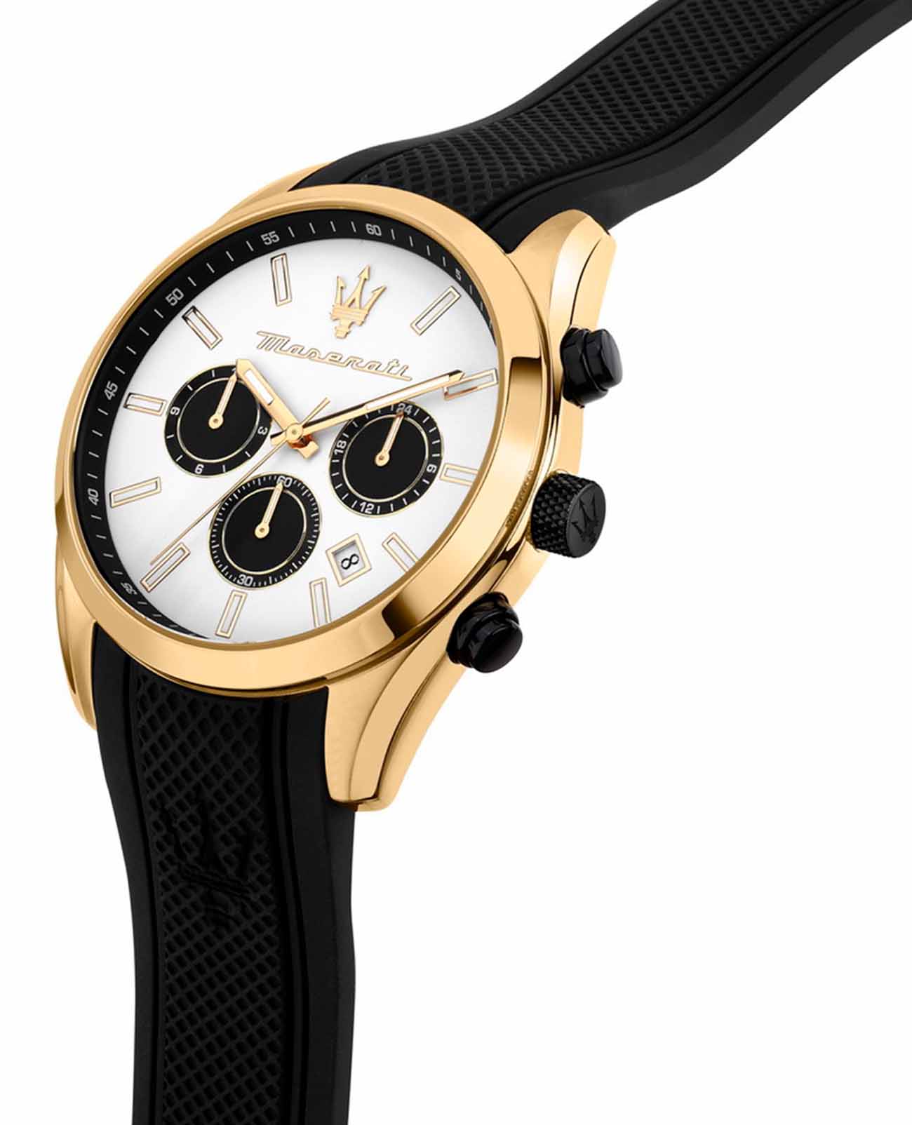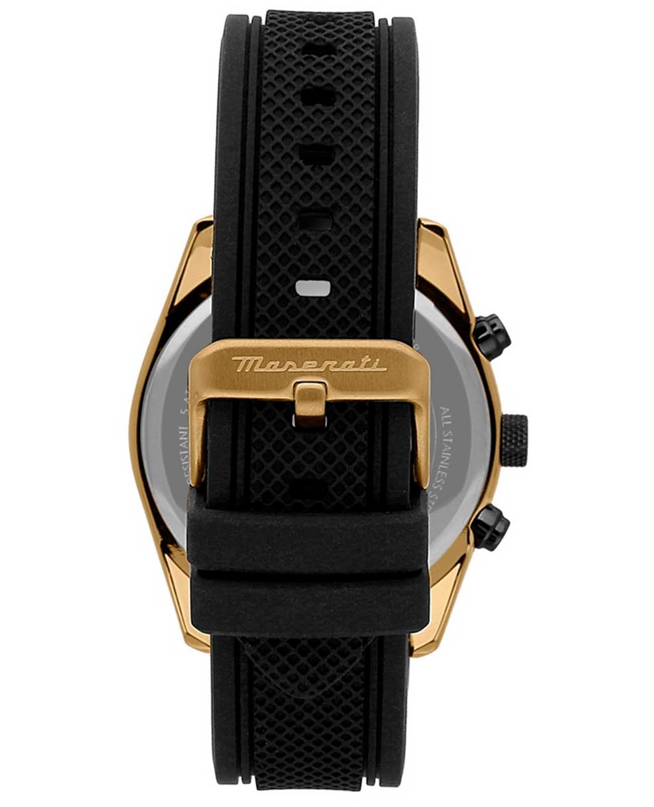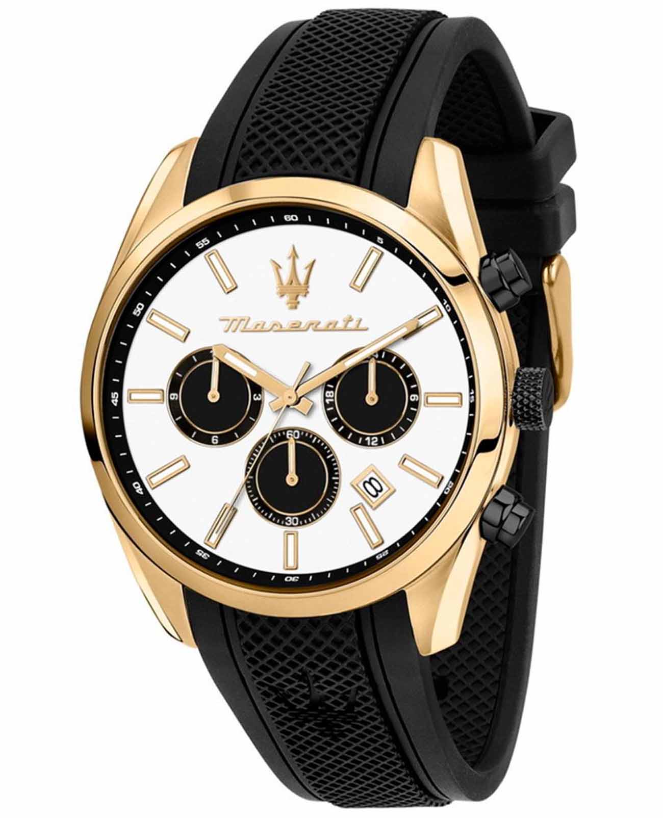Мужские итальянские часы c хронографомХронографФункция позволяет измерять отрезки времени с особой точностью: часы, минуты, секунды. Верным признаком хронографа является наличие на циферблате 3 дополнительных окошек-счётчиков. Maserati Attrazione R8851151001, кварцевый механизм с высокой точностью. Корпус часов изготовлен из стали с PVD-покрытиемPVDУльтратонкое покрытие наносится в технике вакуумного напыления, сочетает в себе нитрид титана особой прочности со слоем золота или оксида хрома. Несёт в себе декоративную или защитную функцию.. Стрелки с люминесцентным покрытиемЛюминесцентное покрытиеПозволяет считывать показания времени в темноте. Производители наносят на стрелки, часовые индексы, безель или поверхность циферблата светонакопительный состав, дающий холодное свечение.. Класс водозащиты: 50 метров, позволит защитить корпус от случайных брызг или капель дождя. Каучуковый ремешок на стандартной застежке.