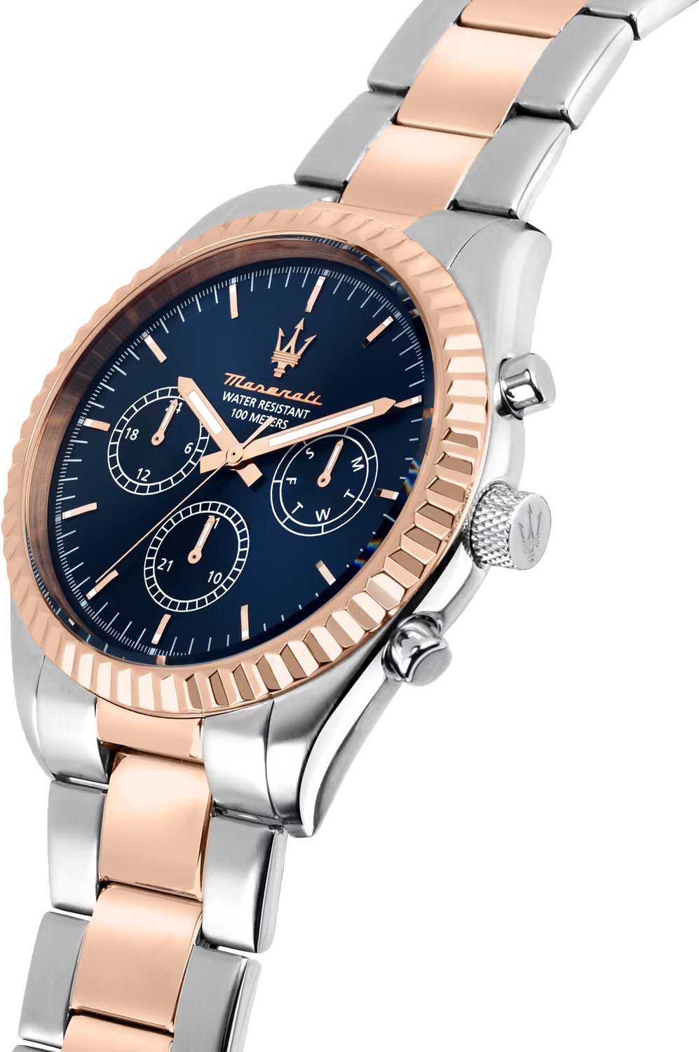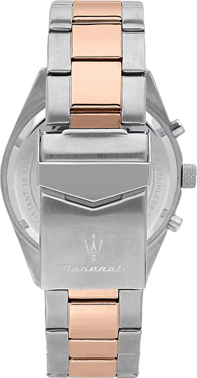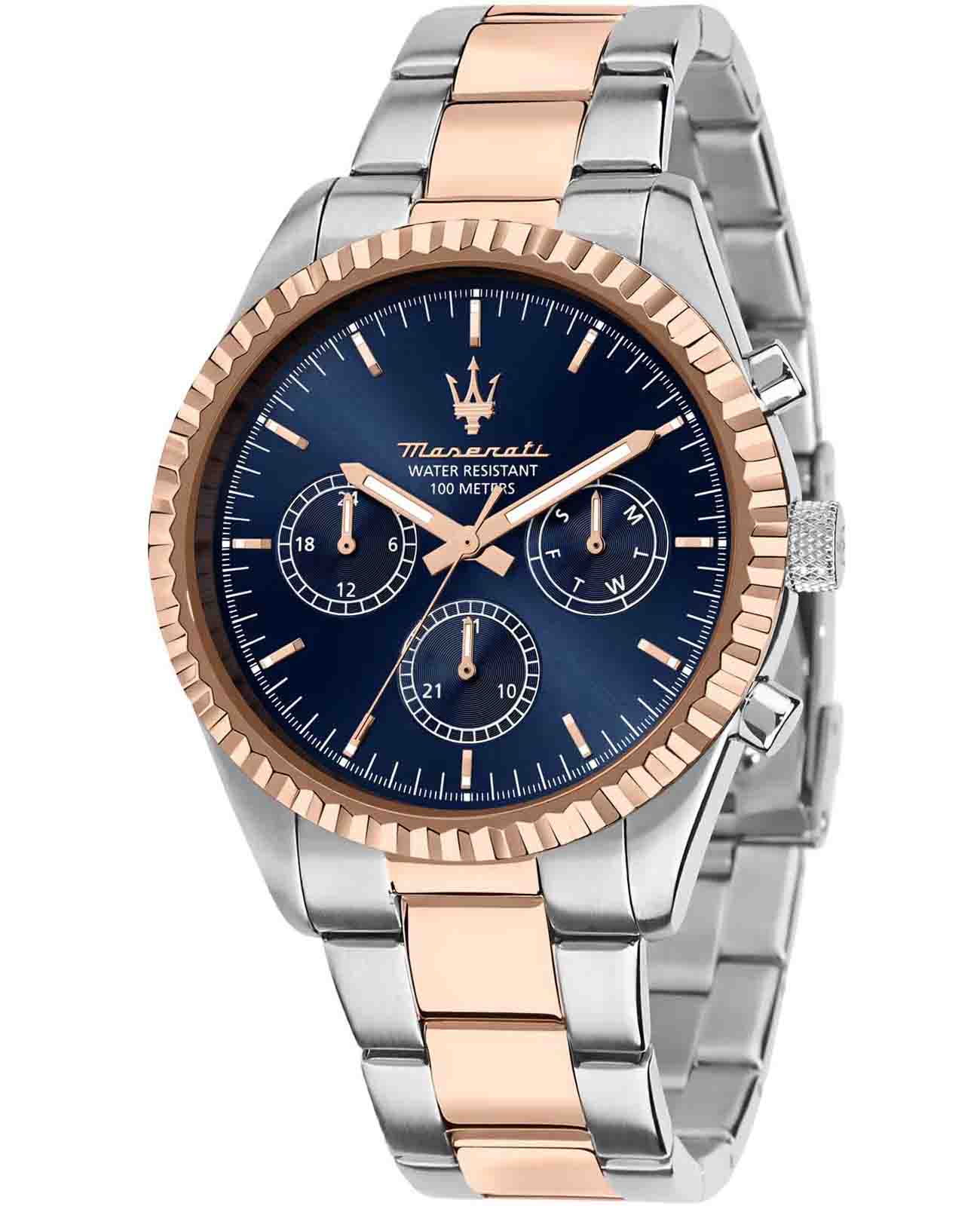 Часы Maserati Competizione R8853100040 отличаются стильным и современным дизайном, идеально подходящим для деловых и повседневных образов. Эти наручные часы оснащены надёжным кварцевым механизмом, который обеспечивает высокую точность показаний времени. Корпус часов диаметром 43 мм выполнен из прочной стали, что гарантирует долговечность и устойчивость к внешним воздействиям. Минеральное стеклоМинеральное стеклоМинеральное стекло представляет собой искусственно выращенный минерал кварца. Такое стекло отличается особой устойчивостью к повреждениям и царапинам. Уступает по некоторым качествам сапфировому стеклу. защищает циферблат. Часы обладают водостойкостью до 100 метров (10 АТМ), что позволяет не беспокоиться о попадании влаги при плавании или занятиях водными видами спорта. Стальной браслет с раскладной застёжкойРаскладная застёжкаТакой тип застёжки используется только на браслетах из металла. Она никогда не раскрывается полностью, происходит разделение на 2 и более частей. Раскладывающая застёжка снизит вероятность потери часов к минимуму. не только обеспечивает комфортное ношение, но и придаёт аксессуару дополнительную элегантность, подчёркивая его современный стиль. Люминесцентное покрытиеЛюминесцентное покрытиеПозволяет считывать показания времени в темноте. Производители наносят на стрелки, часовые индексы, безель или поверхность циферблата светонакопительный состав, дающий холодное свечение. на стрелках обеспечивает отличную видимость в темноте. Циферблат выполнен по технологии Sunray (солнечные лучи) и украшен фирменным логотипом «Maserati». Метки в виде штрихов. Граненый безель. Эти часы станут отличным дополнением к вашему гардеробу, сочетая в себе функциональность и изысканный дизайн.