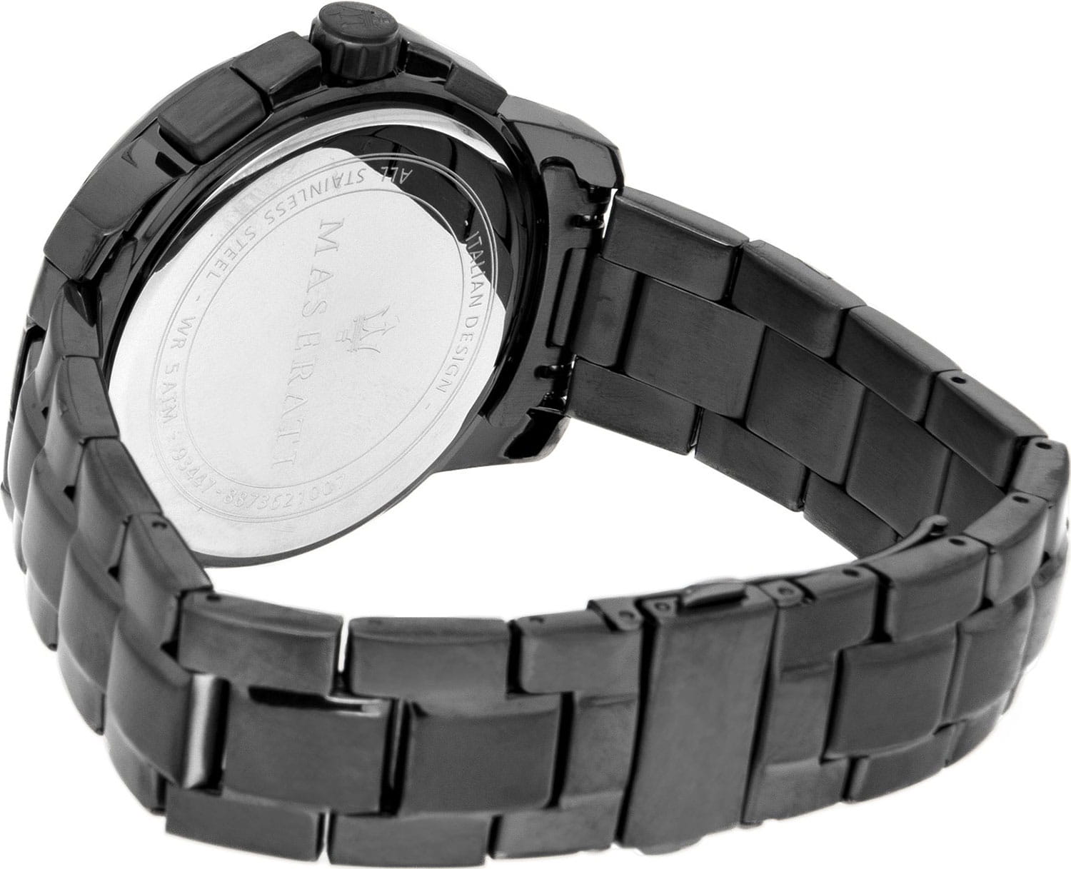 Мужские наручные часы-хронографХронографФункция позволяет измерять отрезки времени с особой точностью: часы, минуты, секунды. Верным признаком хронографа является наличие на циферблате 3 дополнительных окошек-счётчиков. Maserati R8873621007, кварцевый механизм (автоматический калибр) с высокой точностью. Минеральное стеклоМинеральное стеклоМинеральное стекло представляет собой искусственно выращенный минерал кварца. Такое стекло отличается особой устойчивостью к повреждениям и царапинам. Уступает по некоторым качествам сапфировому стеклу. устойчивое к появлению царапин, обладающее высокой прозрачностью. Стрелки с люминесцентным покрытиемЛюминесцентное покрытиеПозволяет считывать показания времени в темноте. Производители наносят на стрелки, часовые индексы, безель или поверхность циферблата светонакопительный состав, дающий холодное свечение.. Класс водозащиты: 50 метров, позволит защитить корпус от случайных брызг или капель дождя. Корпус часов изготовлен из нержавеющей стали с PVD-покрытиемPVDУльтратонкое покрытие наносится в технике вакуумного напыления, сочетает в себе нитрид титана особой прочности со слоем золота или оксида хрома. Несёт в себе декоративную или защитную функцию.. Браслет с раскладной застёжкойРаскладная застёжкаТакой тип застёжки используется только на браслетах из металла. Она никогда не раскрывается полностью, происходит разделение на 2 и более частей. Раскладывающая застёжка снизит вероятность потери часов к минимуму. и с PVD-покрытиемPVDУльтратонкое покрытие наносится в технике вакуумного напыления, сочетает в себе нитрид титана особой прочности со слоем золота или оксида хрома. Несёт в себе декоративную или защитную функцию..