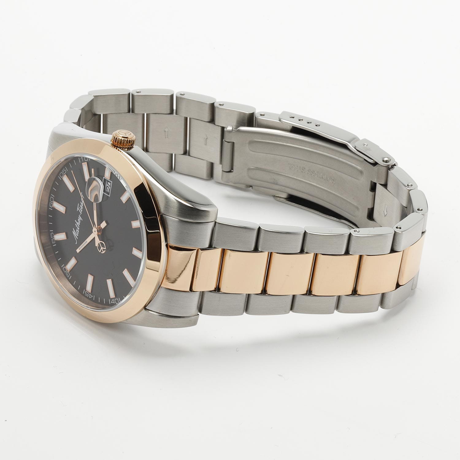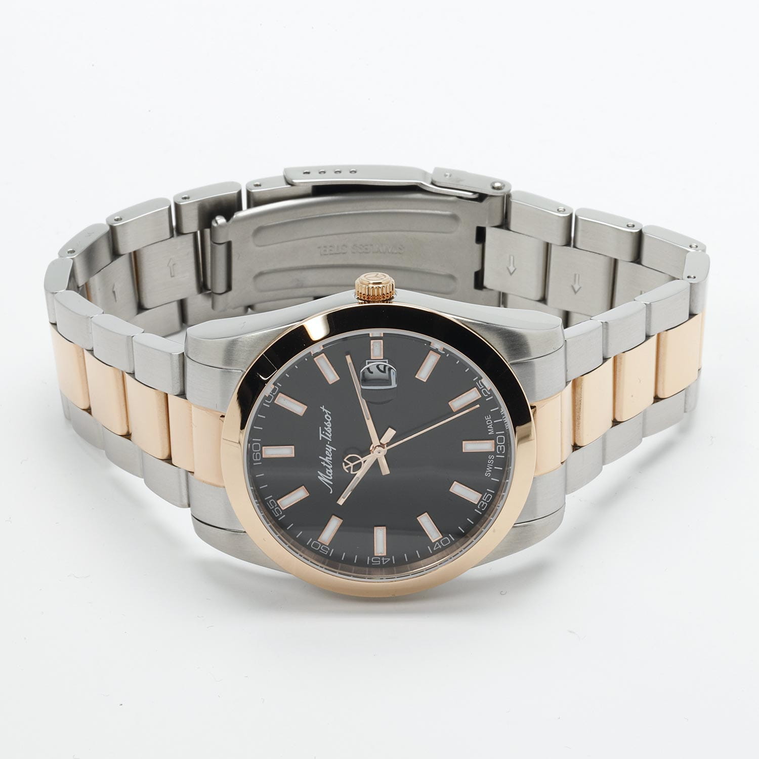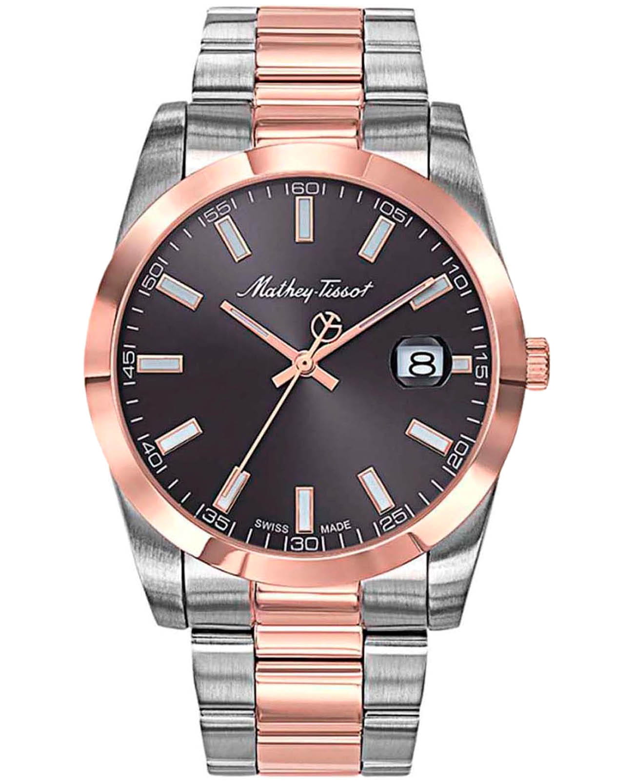 Мужские кварцевые часы Mathey-Tissot Mathy H450RN — это стильное сочетание элегантности и современного дизайна. Изящный корпус выполнен из нержавеющей стали, диаметром 42 мм, что придаст образу элегантности и надежности. Изысканный циферблат с метками в виде штрихов придает модели особый блеск. Циферблат защищен минеральным стекломМинеральное стеклоМинеральное стекло представляет собой искусственно выращенный минерал кварца. Такое стекло отличается особой устойчивостью к повреждениям и царапинам. Уступает по некоторым качествам сапфировому стеклу., обеспечивает устойчивость к царапинам. Стрелки и метки с люминесцентным покрытиемЛюминесцентное покрытиеПозволяет считывать показания времени в темноте. Производители наносят на стрелки, часовые индексы, безель или поверхность циферблата светонакопительный состав, дающий холодное свечение.. БезельБезельВнешний ободок, закрепляющий стекло. В спортивных часах так называется поворотное кольцо с делениями на циферблате, выполняет роль таймера – замеряет отрезки времени на шкале. Неподвижный безель – элемент декора. Однонаправленно вращающийся безель на дайверских часах позволяет фиксировать моменты погружения и выныривания на поверхность. с PVD-покрытиемPVDУльтратонкое покрытие наносится в технике вакуумного напыления, сочетает в себе нитрид титана особой прочности со слоем золота или оксида хрома. Несёт в себе декоративную или защитную функцию. цвета розового золота. Окошко даты находится в положении 3 часа. Часы оснащены надежным кварцевым механизмом. Стальной браслет с частичным PVD-покрытиемPVDУльтратонкое покрытие наносится в технике вакуумного напыления, сочетает в себе нитрид титана особой прочности со слоем золота или оксида хрома. Несёт в себе декоративную или защитную функцию. на раскладной застёжке с фиксаторомРаскладная застёжкаТакой тип застёжки используется только на браслетах из металла. Она никогда не раскрывается полностью, происходит разделение на 2 и более частей. Раскладывающая застёжка снизит вероятность потери часов к минимуму., гарантирует комфортное и безопасное ношение. Рифленая заводная головка. Класс водозащиты: 50 метров позволит защитить корпус от случайных брызг или капель дождя. Mathey-Tissot  — отличный выбор для тех, кто ценит утонченность и качество.