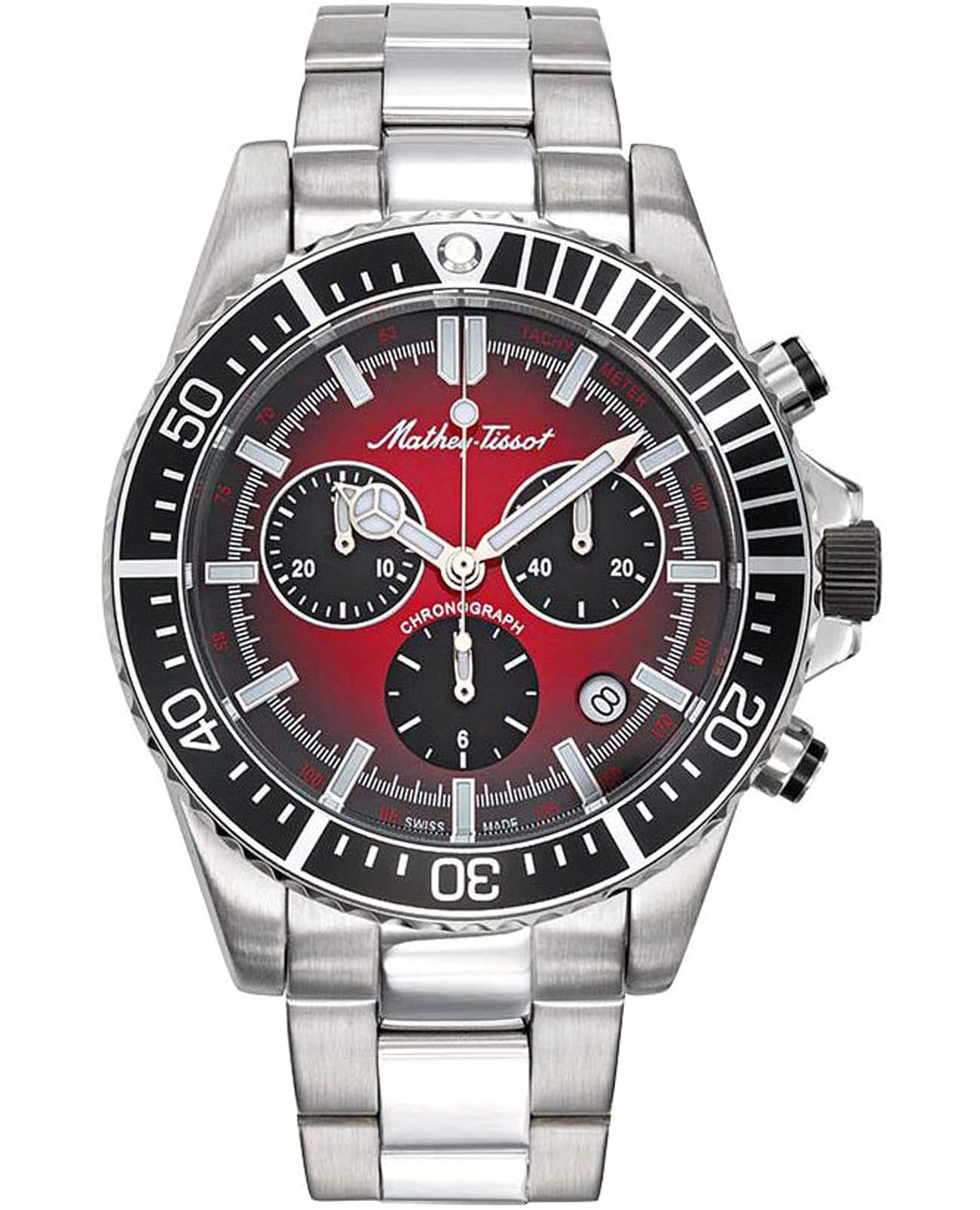 Мужские кварцевые часы-хронографХронографФункция позволяет измерять отрезки времени с особой точностью: часы, минуты, секунды. Верным признаком хронографа является наличие на циферблате 3 дополнительных окошек-счётчиков. с секундомеромСекундомерСекундоме́р — прибор, способный измерять интервалы времени с точностью до долей секунды. Mathey-Tissot Mathy H908CHAR — это стильное сочетание элегантности и современного дизайна. Изящный корпус выполнен из нержавеющей стали, диаметром 42 мм, что придаст образу элегантности и надежности. Изысканный циферблат с метками в виде штрихов придает модели особый блеск. Циферблат защищен минеральным стекломМинеральное стеклоМинеральное стекло представляет собой искусственно выращенный минерал кварца. Такое стекло отличается особой устойчивостью к повреждениям и царапинам. Уступает по некоторым качествам сапфировому стеклу. с сапфировым покрытием, обеспечивает устойчивость к царапинам. Стрелки и метки с люминесцентным покрытиемЛюминесцентное покрытиеПозволяет считывать показания времени в темноте. Производители наносят на стрелки, часовые индексы, безель или поверхность циферблата светонакопительный состав, дающий холодное свечение.. БезельБезельВнешний ободок, закрепляющий стекло. В спортивных часах так называется поворотное кольцо с делениями на циферблате, выполняет роль таймера – замеряет отрезки времени на шкале. Неподвижный безель – элемент декора. Однонаправленно вращающийся безель на дайверских часах позволяет фиксировать моменты погружения и выныривания на поверхность. с PVD-покрытиемPVDУльтратонкое покрытие наносится в технике вакуумного напыления, сочетает в себе нитрид титана особой прочности со слоем золота или оксида хрома. Несёт в себе декоративную или защитную функцию.. Окошко даты находится в положении между 4 и 5 часов. ТахиметрТахиметрРазмеченная шкала, располагается на ободке или безеле часов. Тахиметр позволяет рассчитать скорость на определённом участке пути, расстояние измеряется в километрах или милях. по внешнему краю. Стальной браслет на раскладной застёжке с фиксаторомРаскладная застёжкаТакой тип застёжки используется только на браслетах из металла. Она никогда не раскрывается полностью, происходит разделение на 2 и более частей. Раскладывающая застёжка снизит вероятность потери часов к минимуму., гарантирует комфортное и безопасное ношение. Рифленая заводная головка. Класс водозащиты: 100 метров позволит плавать, нырять и заниматься другими водными видами спорта. Mathey-Tissot — отличный выбор для тех, кто ценит утонченность и качество.