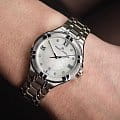 Белый перламутровый циферблат украшен 8 бриллиантовыми метками, которые придают часам утончённый блеск. Серебристые стрелки подчёркивают элегантность дизайна, а окошко даты расположено на отметке «6 часов».