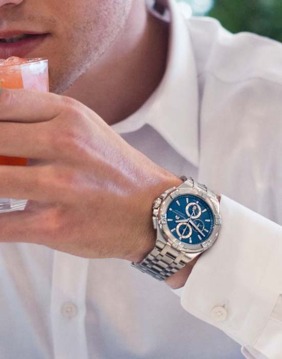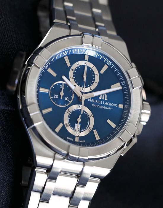 Мужские швейцарские часы с хронографом Maurice Lacroix Aikon Chronograph AI1018-SS002-430-1, кварцевый механизм с высокой точностью. Сапфировое стеклоСапфировое стеклоПрочный и надёжный материал из кристалла сапфира синтетического происхождения, характеризующийся особой твёрдостью и устойчивостью к царапинам и повреждениям. устойчивое к появлению царапин, обладающее высокой прозрачностью. Класс водозащиты: 100 метров, позволит плавать, нырять и заниматься другими водными видами спорта. Корпус и браслет часов изготовлены из нержавеющей стали. На циферблате расположены три дополнительных индикатора. Стрелки с люминесцентным покрытиемЛюминесцентное покрытиеПозволяет считывать показания времени в темноте. Производители наносят на стрелки, часовые индексы, безель или поверхность циферблата светонакопительный состав, дающий холодное свечение.. Стальной браслет на застёжке-бабочке с кнопкамиЗастёжка "бабочка"Такой вид застёжки дополняется предохранителями, помогающими избежать случайного раскрытия браслета. Обладают изящным исполнением. .