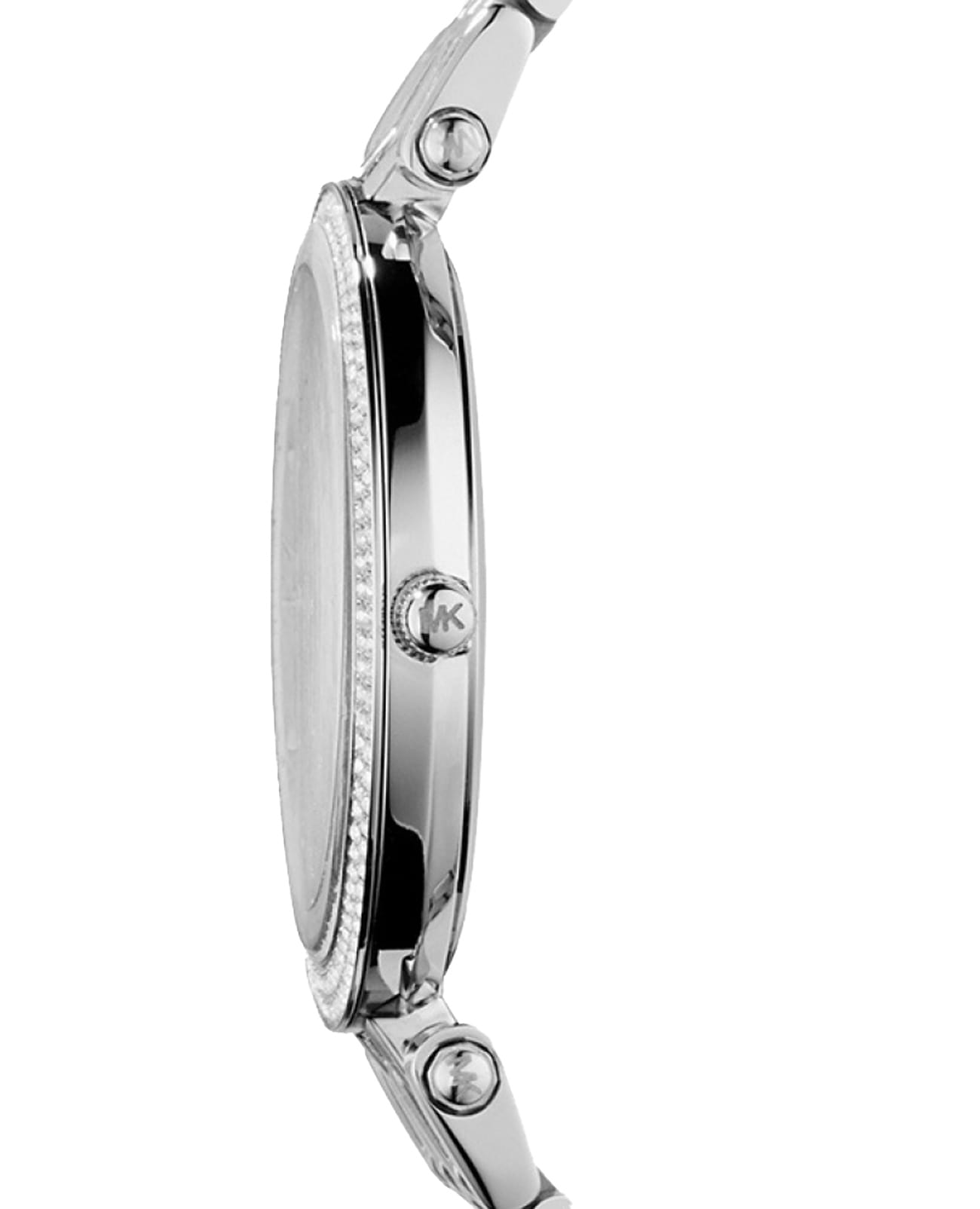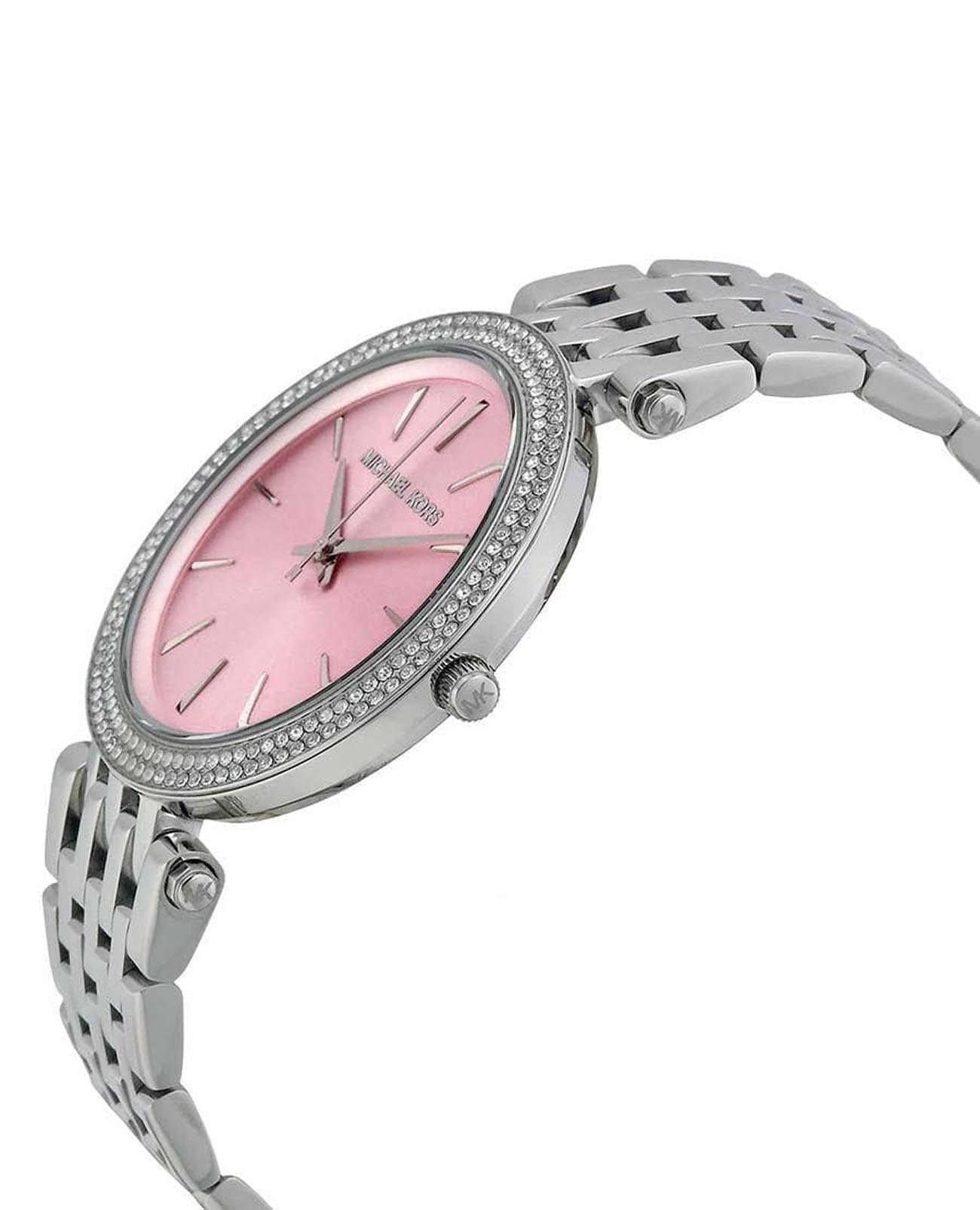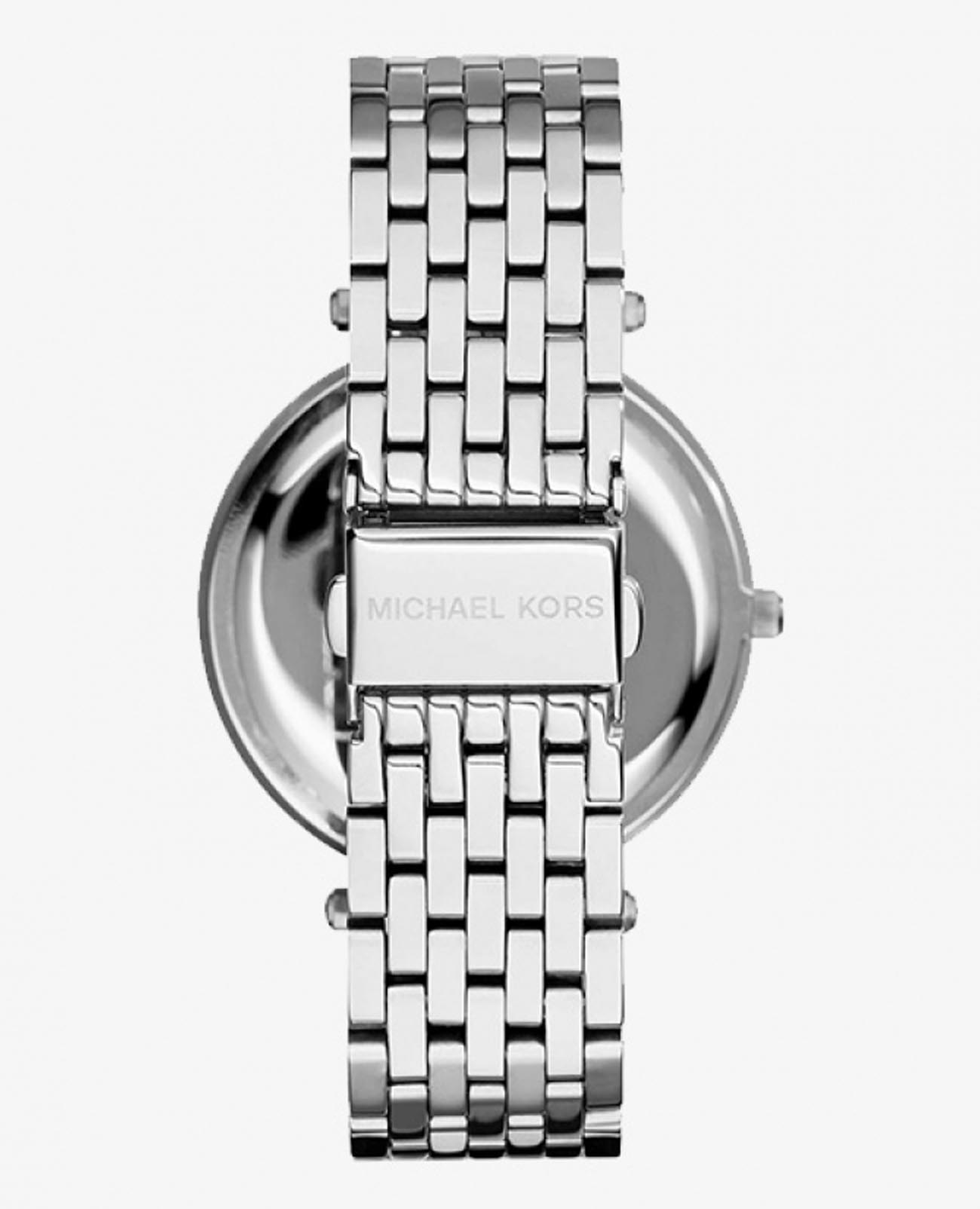 Женские американские часы Michael Kors Darci MK3352, кварцевый механизм с высокой точностью. Минеральное стеклоМинеральное стеклоМинеральное стекло представляет собой искусственно выращенный минерал кварца. Такое стекло отличается особой устойчивостью к повреждениям и царапинам. Уступает по некоторым качествам сапфировому стеклу., устойчивое к мелким механическим повреждениям. Корпус часов выполнен из нержавеющей стали. БезельБезельВнешний ободок, закрепляющий стекло. В спортивных часах так называется поворотное кольцо с делениями на циферблате, выполняет роль таймера – замеряет отрезки времени на шкале. Неподвижный безель – элемент декора. Однонаправленно вращающийся безель на дайверских часах позволяет фиксировать моменты погружения и выныривания на поверхность. украшен кристаллами. Класс водозащиты: 50 метров, позволит защитить корпус от случайных брызг или капель дождя. Стальной браслет на раскладной застёжкеРаскладная застёжкаТакой тип застёжки используется только на браслетах из металла. Она никогда не раскрывается полностью, происходит разделение на 2 и более частей. Раскладывающая застёжка снизит вероятность потери часов к минимуму..