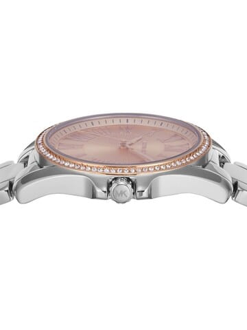 Откройте для себя сочетание современного стиля и функциональности в часах Michael Kors Kacie MK4854 — потрясающих серебряных часах, созданных для женщин, которые ценят изысканность и утонченность. Эти часы легко дополнят любой образ и станут идеальным аксессуаром как для повседневного, так и для официального мероприятия. Кварцевый механизм с высокой точностью. Корпус часов изготовлен из нержавеющей стали, диаметром 39 мм. БезельБезельВнешний ободок, закрепляющий стекло. В спортивных часах так называется поворотное кольцо с делениями на циферблате, выполняет роль таймера – замеряет отрезки времени на шкале. Неподвижный безель – элемент декора. Однонаправленно вращающийся безель на дайверских часах позволяет фиксировать моменты погружения и выныривания на поверхность. с PVD-покрытиемPVDУльтратонкое покрытие наносится в технике вакуумного напыления, сочетает в себе нитрид титана особой прочности со слоем золота или оксида хрома. Несёт в себе декоративную или защитную функцию. инкрустирован кристаллами. Циферблат с метками в виде римских цифр защищен минеральным стекломМинеральное стеклоМинеральное стекло представляет собой искусственно выращенный минерал кварца. Такое стекло отличается особой устойчивостью к повреждениям и царапинам. Уступает по некоторым качествам сапфировому стеклу., что обеспечивает надежную защиту от царапин и повреждений. Класс водозащиты: 50 метров позволит защитить корпус от случайных брызг или капель дождя. Удобный стальной браслет на раскладной застёжкеРаскладная застёжкаТакой тип застёжки используется только на браслетах из металла. Она никогда не раскрывается полностью, происходит разделение на 2 и более частей. Раскладывающая застёжка снизит вероятность потери часов к минимуму. обеспечивает надежную фиксацию на запястье и легкость в надевании и снятии. Клиновидные стрелки в стиле Dauphine. Рифленая заводная головка.