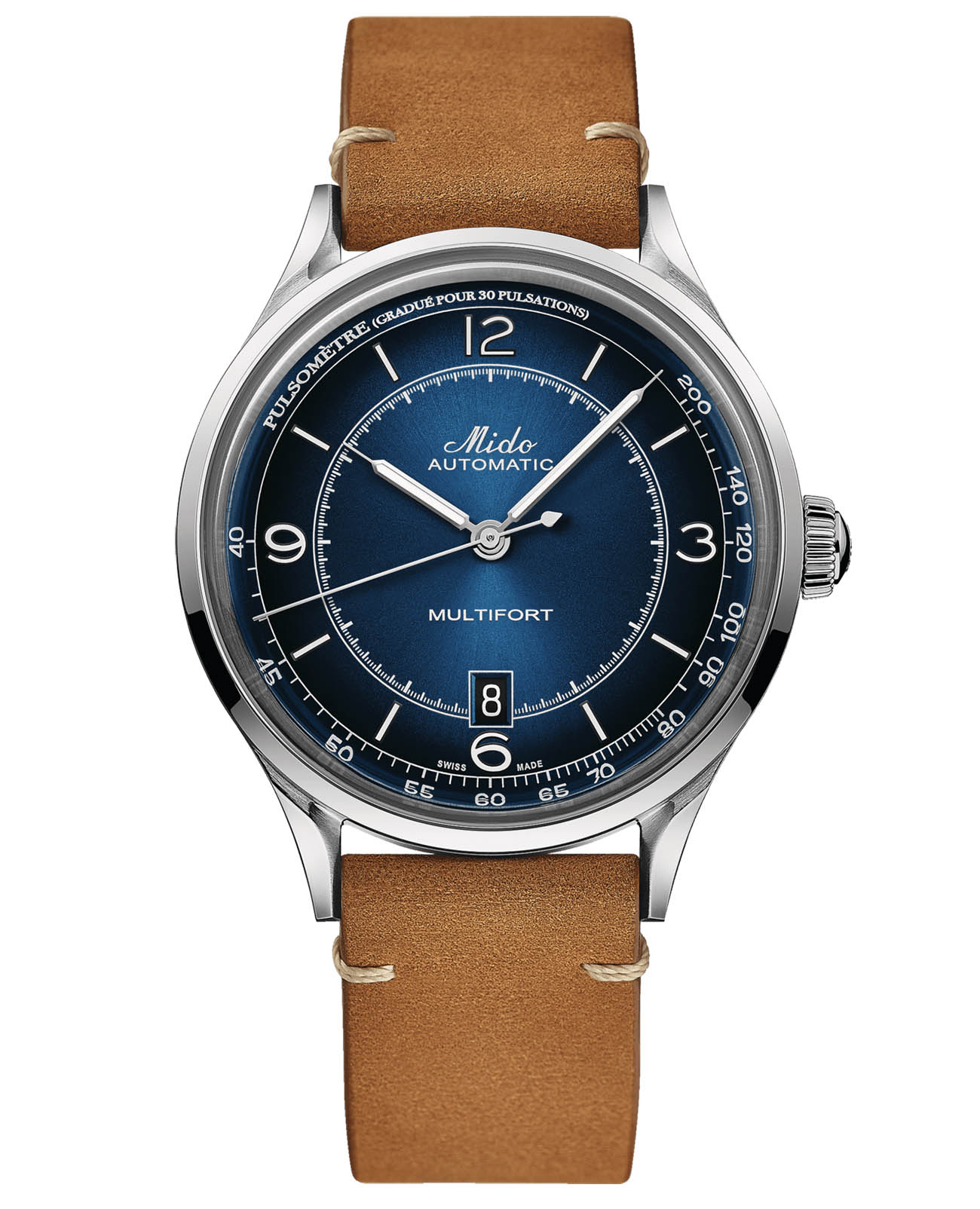 Часы MIDO Multifort Patrimony (артикул M040.407.16.040.00) сочетают элегантный ретро-дизайн и современные технологии, вдохновлённые историческими моделями MIDO. Корпус диаметром 40 мм выполнен из нержавеющей стали с водозащитой до 5 бар (50 метров). Прозрачная задняя крышка подчёркивает изысканный механизм. Синий циферблат с солнечным узором оснащён накладными часовыми метками и стрелками с покрытием Super-LumiNova®Люминесцентное покрытиеПозволяет считывать показания времени в темноте. Производители наносят на стрелки, часовые индексы, безель или поверхность циферблата светонакопительный состав, дающий холодное свечение.. Окошко даты расположено в положении «6 часов». Циферблат защищён сапфировым стекломСапфировое стеклоПрочный и надёжный материал из кристалла сапфира синтетического происхождения, характеризующийся особой твёрдостью и устойчивостью к царапинам и повреждениям. с антибликовым покрытием.