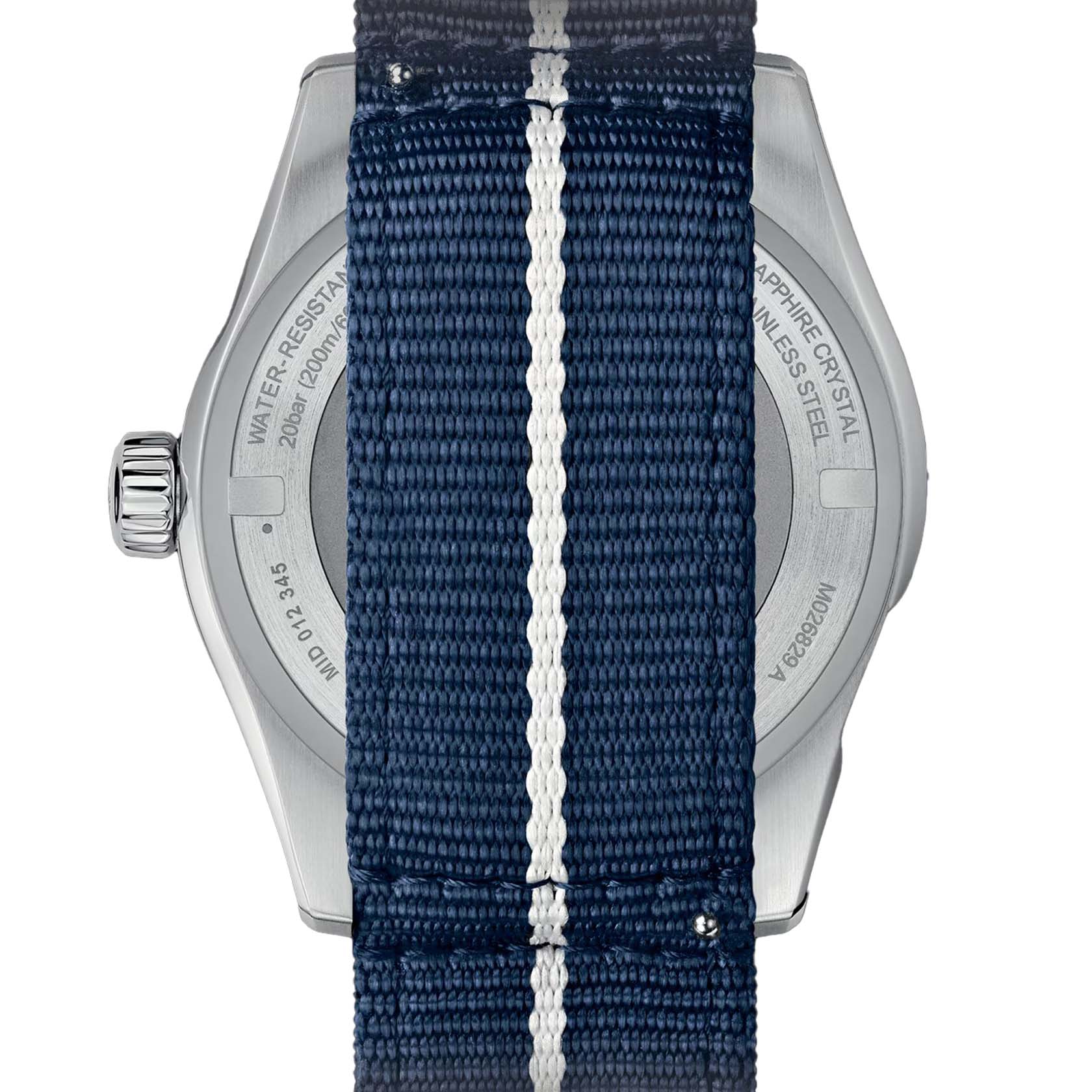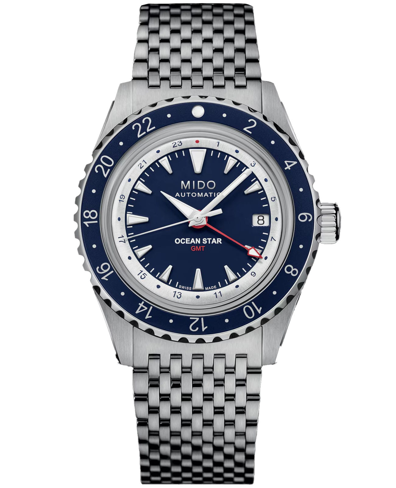 Часы MIDO Ocean Star GMT (артикул M026.829.18.041.00) сочетают элегантность и функциональность, идеально подходя для путешественников и любителей водных видов спорта. Корпус диаметром 40,5 мм выполнен из нержавеющей стали с вращающимся безелем и 24-часовой шкалой. Водозащита до 20 бар (200 метров) и завинчивающаяся заводная головка обеспечивают надёжность. Синий циферблат с матовой отделкой, накладными часовыми метками и стрелками типа «дофин», покрытыми Super-LumiNova®Люминесцентное покрытиеПозволяет считывать показания времени в темноте. Производители наносят на стрелки, часовые индексы, безель или поверхность циферблата светонакопительный состав, дающий холодное свечение., защищён сапфировым стекломСапфировое стеклоПрочный и надёжный материал из кристалла сапфира синтетического происхождения, характеризующийся особой твёрдостью и устойчивостью к царапинам и повреждениям..