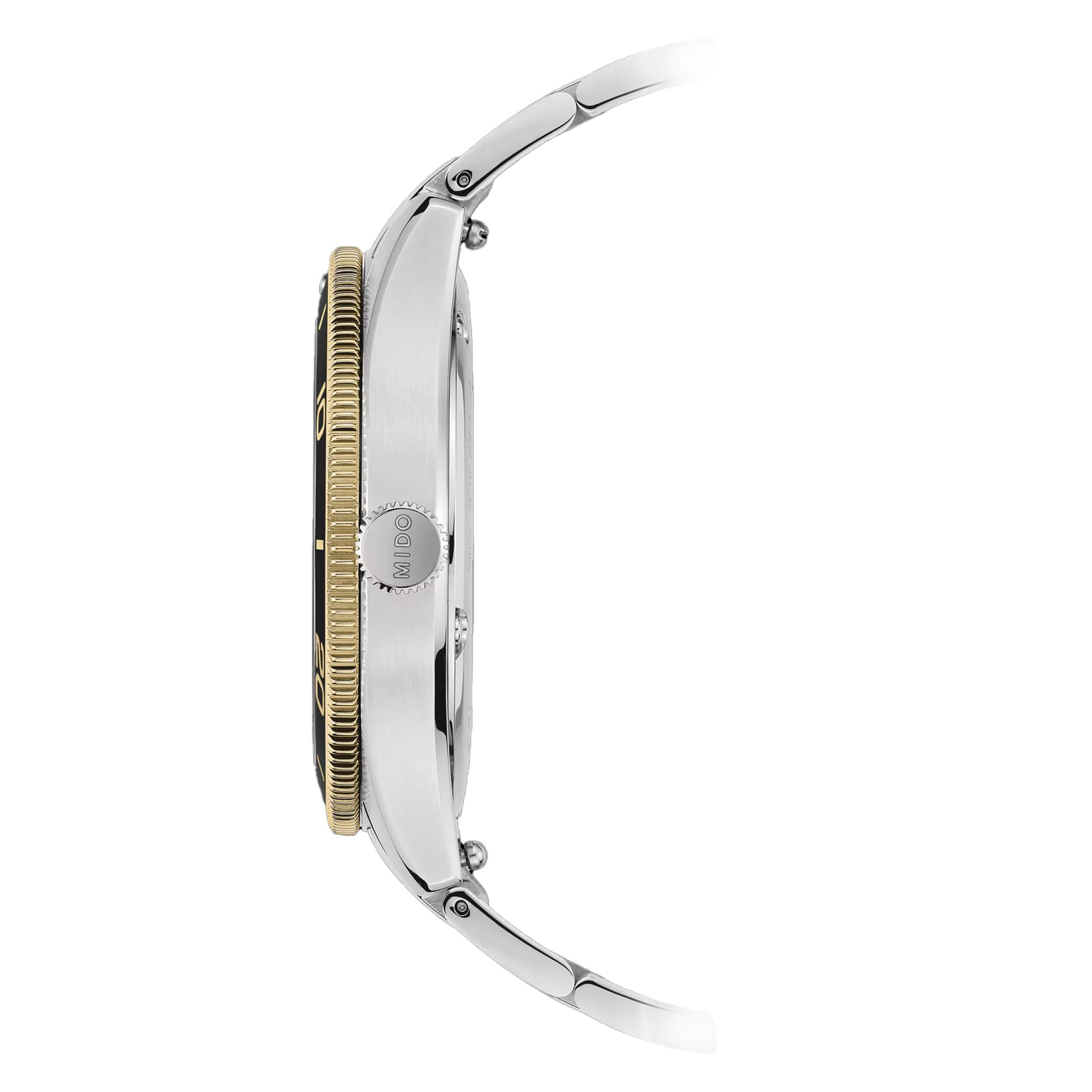 Мужские швейцарские механические часы с сапфировым стеклом Mido Ocean Star 39 M026.907.21.021.00, механический механизм (автоматический калибр) с высокой точностью. Сапфировое стеклоСапфировое стеклоПрочный и надёжный материал из кристалла сапфира синтетического происхождения, характеризующийся особой твёрдостью и устойчивостью к царапинам и повреждениям. устойчивое к появлению царапин, обладающее высокой прозрачностью. Корпус часов изготовлен из стали. Вращающийся безельБезельВнешний ободок, закрепляющий стекло. В спортивных часах так называется поворотное кольцо с делениями на циферблате, выполняет роль таймера – замеряет отрезки времени на шкале. Неподвижный безель – элемент декора. Однонаправленно вращающийся безель на дайверских часах позволяет фиксировать моменты погружения и выныривания на поверхность. из нержавеющей стали с PVDPVDУльтратонкое покрытие наносится в технике вакуумного напыления, сочетает в себе нитрид титана особой прочности со слоем золота или оксида хрома. Несёт в себе декоративную или защитную функцию. покрытием и керамики с покрытием Superluminova. Циферблат украшают метки с бриллиантами. Стрелки с люминесцентным покрытиемЛюминесцентное покрытиеПозволяет считывать показания времени в темноте. Производители наносят на стрелки, часовые индексы, безель или поверхность циферблата светонакопительный состав, дающий холодное свечение.. Окошко даты в положении 3 часов. Класс водозащиты: 200 метров, позволит плавать, нырять и заниматься другими водными видами спорта.