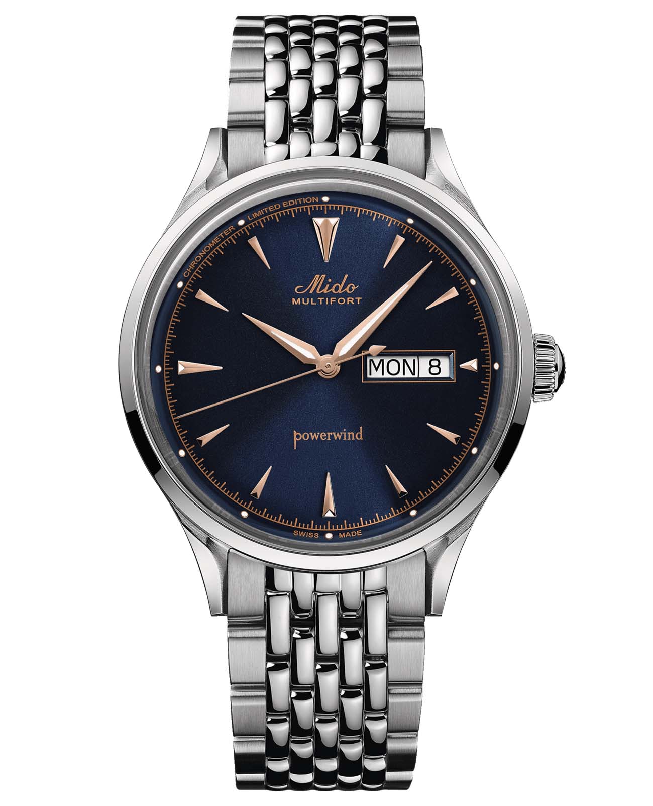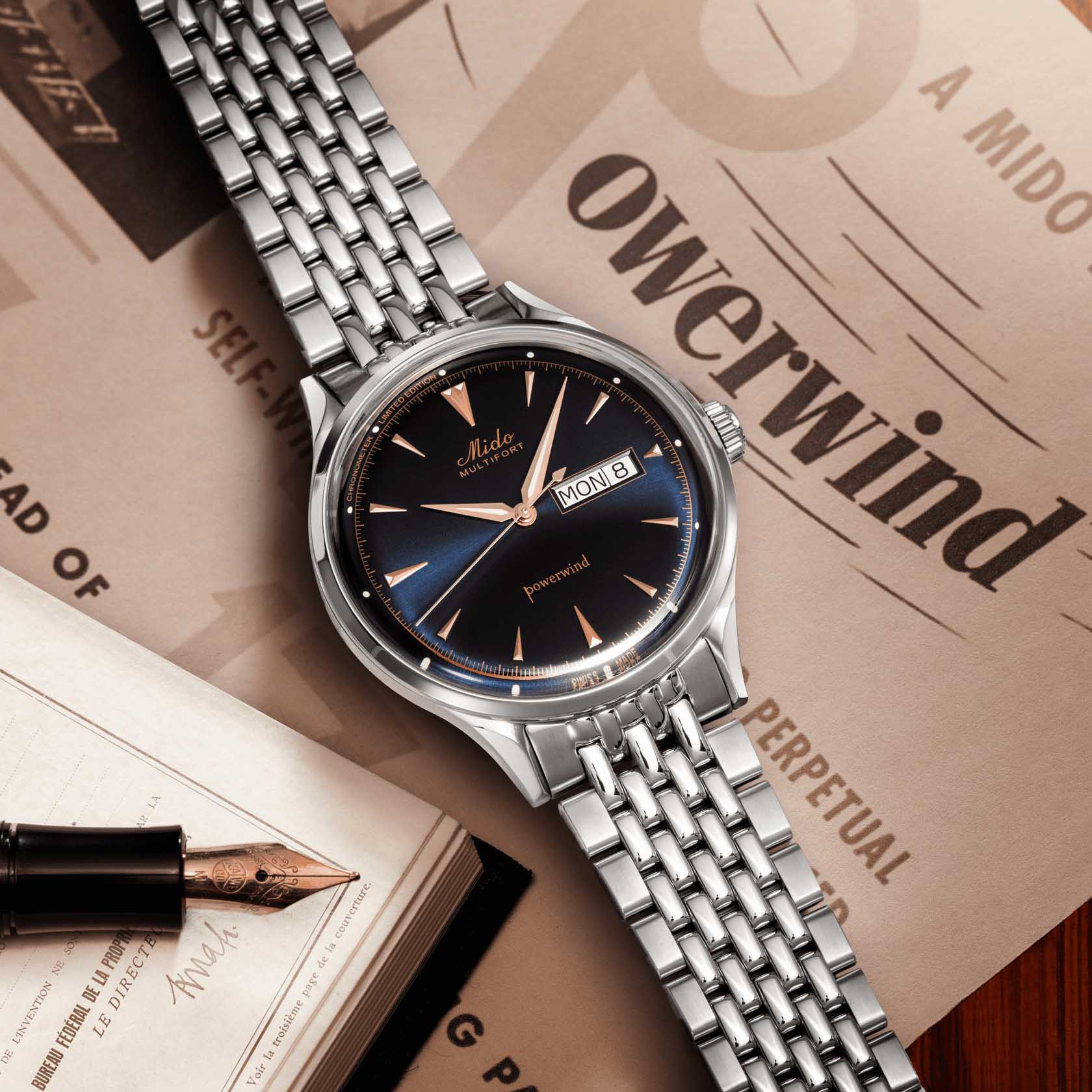 Благодаря своему ретро-дизайну и исключительной надежности хронометр Multifort Powerwind знаменует собой важную веху в истории Mido и ее многолетнем опыте часового мастерства. Эта лимитированная коллекция представленна ограниченным тиражом, состоящим из 1954 моделей и названа в честь революционной модели « Powerwind », выпущенной в 1954 году, которая на тот момент была самым точным и надежным механизмом Mido. Сегодня, стремясь обеспечить столь же надежное и точное измерение времени, компания Mido оснастила новые швейцарские часы Multifort самыми передовыми современными технологиями благодаря хронометру, сертифицированному COSC.
