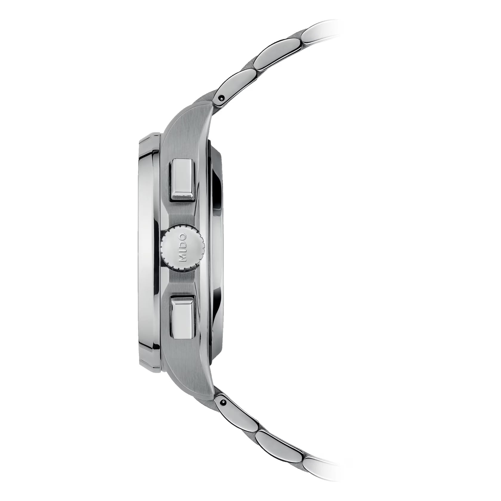 Мужские механические швейцарские часы Mido Multifort TV Chronograph M049.527.11.041.00, механический механизм с высокой точностью. Сапфировое стеклоСапфировое стеклоПрочный и надёжный материал из кристалла сапфира синтетического происхождения, характеризующийся особой твёрдостью и устойчивостью к царапинам и повреждениям. устойчивое к появлению царапин, обладающее высокой прозрачностью. Корпус часов изготовлен из нержавеющей стали. В механизм внедрена пружина баланса Nivachron™Nivachron™Специально разработанный инновационный сплав Nivachron™ повышает устойчивость часов к воздействию магнитных полей.. Стрелки с люминесцентным покрытиемЛюминесцентное покрытиеПозволяет считывать показания времени в темноте. Производители наносят на стрелки, часовые индексы, безель или поверхность циферблата светонакопительный состав, дающий холодное свечение.. Окошко даты в положении между 4 и 6 часами. Класс водозащиты: 100 метров, позволит плавать, нырять и заниматься другими водными видами спорта. Стальной браслет на раскладной застёжкеРаскладная застёжкаТакой тип застёжки используется только на браслетах из металла. Она никогда не раскрывается полностью, происходит разделение на 2 и более частей. Раскладывающая застёжка снизит вероятность потери часов к минимуму..Часы с функциями хронографаХронографФункция позволяет измерять отрезки времени с особой точностью: часы, минуты, секунды. Верным признаком хронографа является наличие на циферблате 3 дополнительных окошек-счётчиков. и тахиметраТахиметрРазмеченная шкала, располагается на ободке или безеле часов. Тахиметр позволяет рассчитать скорость на определённом участке пути, расстояние измеряется в километрах или милях.. Поставляются с дополнительным ремешком, что обеспечивает еще большую универсальность и комфорт.
