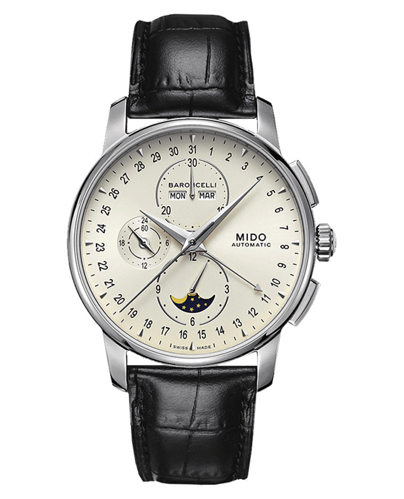 Швейцарские мужские наручные часы Mido Baroncelli 8607.4.M1.42, механический механизм (автоматический калибр) с высокой точностью. Сапфировое стеклоСапфировое стеклоПрочный и надёжный материал из кристалла сапфира синтетического происхождения, характеризующийся особой твёрдостью и устойчивостью к царапинам и повреждениям. устойчивое к появлению царапин, обладающее высокой прозрачностью. Класс водозащиты: 50 метров, позволит защитить корпус от случайных брызг или капель дождя. Корпус часов изготовлен из стали, серебристого цвета. В модели есть хронографХронографФункция позволяет измерять отрезки времени с особой точностью: часы, минуты, секунды. Верным признаком хронографа является наличие на циферблате 3 дополнительных окошек-счётчиков., 12-часовой счетчик расположен на 6 часов, 30-минутный на 12 часов и малая секунда на 9 часов. Центральная стрелка-указатель даты, апертура месяца и дня недели лаконично расположена на 12 часов, индикатор фазы луны.