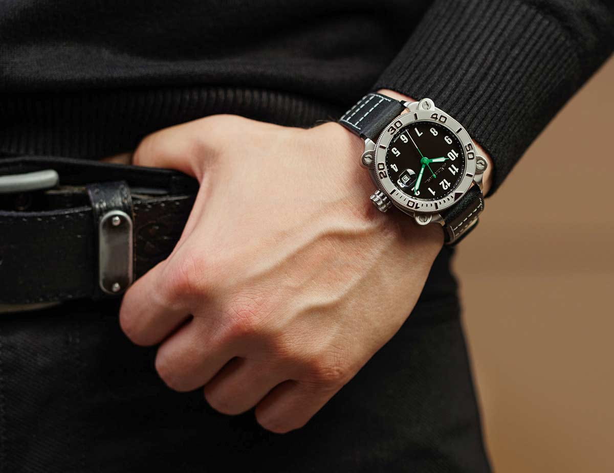 Мужские механические часы с автоподзаводом от бренда «МОЛНИЯ» — это стильный аксессуар, вдохновлённый дизайном приборной панели легендарного танка Т-72. Корпус диаметром 42 мм и толщиной 12 мм выполнен из нержавеющей стали 316L с матовой полировкой. БезельБезельВнешний ободок, закрепляющий стекло. В спортивных часах так называется поворотное кольцо с делениями на циферблате, выполняет роль таймера – замеряет отрезки времени на шкале. Неподвижный безель – элемент декора. Однонаправленно вращающийся безель на дайверских часах позволяет фиксировать моменты погружения и выныривания на поверхность. однонаправленный, вращающийся. Циферблат чёрного цвета оформлен арабскими цифрами и логотипом бренда. Окошко даты расположено в положении 3 часов и оснащено увеличительным стеклом. Стрелки и метки с люминесцентным покрытиемЛюминесцентное покрытиеПозволяет считывать показания времени в темноте. Производители наносят на стрелки, часовые индексы, безель или поверхность циферблата светонакопительный состав, дающий холодное свечение. Super-LumiNova. Циферблат защищён сапфировым стекломСапфировое стеклоПрочный и надёжный материал из кристалла сапфира синтетического происхождения, характеризующийся особой твёрдостью и устойчивостью к царапинам и повреждениям. с антибликовым покрытиемАнтибликовое покрытиеСлой оксида металла в 0,13-0,3 микрон, благодаря которому стекло часов не бликует и не отражает свет. Антибликовое покрытие уменьшает отражение света в 10 раз, обеспечивая отличную читаемость показателей циферблата.. Механизм — японский автоматический калибр Miyota 8215 запас хода до 42 часов. Заводная головка стилизована под гусеничную ленту, задняя крышка с гравировкой танка Т-72. Часы оснащены кожаным ремешком чёрного цвета с классической пряжкой и системой быстрой замены. Водонепроницаемость 100 м позволяет использовать часы для плавания и повседневного ношения. Идеальный выбор для тех, кто ценит инженерное наследие и мощный дизайн.