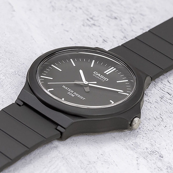 Мужские кварцевые часы Центральные часовая, минутная и секундная стрелки Светящееся покрытие обеспечивает длительную подсветку в темное время суток после короткого воздействия света Черный циферблат Круглый корпус выполнен из черного полимерного пластика Размер корпуса составляет 48x44x10 мм Браслет из черного полимерного материала с классической пряжкой Пластиковое стекло Водостойкость WR 50 (мытье рук, дождь) Вес 35 г