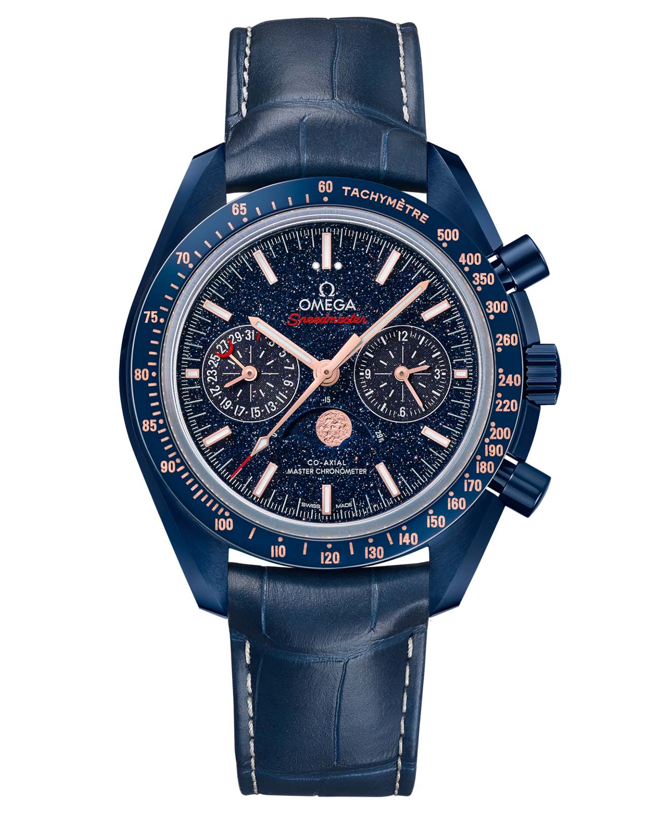 Speedmaster Blue Side of the Moon — дань уважения шести легендарным лунным миссиям, вдохновленная таинственным синим сиянием космоса. 44,25-мм корпус из высокотехнологичной керамики глубокого синего цвета с керамическим безелемБезельВнешний ободок, закрепляющий стекло. В спортивных часах так называется поворотное кольцо с делениями на циферблате, выполняет роль таймера – замеряет отрезки времени на шкале. Неподвижный безель – элемент декора. Однонаправленно вращающийся безель на дайверских часах позволяет фиксировать моменты погружения и выныривания на поверхность., украшенным тахиметрической шкалойТахиметрРазмеченная шкала, располагается на ободке или безеле часов. Тахиметр позволяет рассчитать скорость на определённом участке пути, расстояние измеряется в километрах или милях. из OMEGA Ceragold™, сочетается с синим кожаным ремешком и раскладывающейся застежкой из титана с керамической отделкой. Циферблат из мерцающего авантюринового стекла демонстрирует индексы и стрелки из золота Sedna™18-каратное золотоОбозначение по каратной системе пробирования, оно показывает, сколько драгоценного металла содержится в изделии. 18 карат - в составе 75% чистого золота, соответствует 750 пробе.