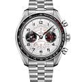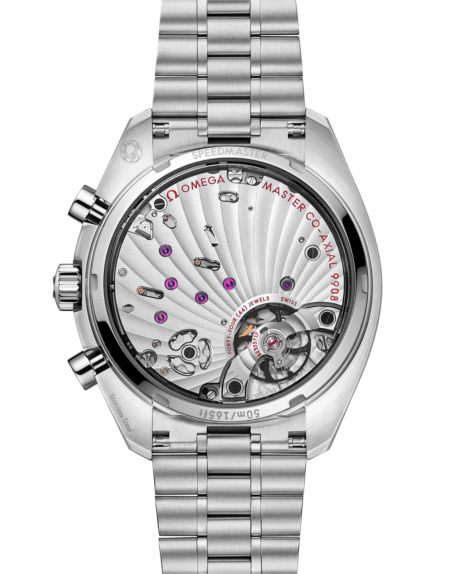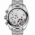 Chronoscope искусно переосмысливает наследие OMEGA, соединяя винтажную эстетику 1940-х с культовым стилем Speedmaster. 43-мм корпус из нержавеющей стали с черным безелемБезельВнешний ободок, закрепляющий стекло. В спортивных часах так называется поворотное кольцо с делениями на циферблате, выполняет роль таймера – замеряет отрезки времени на шкале. Неподвижный безель – элемент декора. Однонаправленно вращающийся безель на дайверских часах позволяет фиксировать моменты погружения и выныривания на поверхность. из анодированного алюминия обрамляет серебристый циферблат с контрастными чернеными элементами. Уникальный спиралевидный узор подчеркивает три исторические шкалы в форме улитки: тахиметрическуюТахиметрРазмеченная шкала, располагается на ободке или безеле часов. Тахиметр позволяет рассчитать скорость на определённом участке пути, расстояние измеряется в километрах или милях., пульсометрическую и телеметрическую. Черненые стрелки в форме листьев и арабские цифры создают элегантный монохромный образ. На позиции "9 часов" расположен счетчик малых секунд, а на "3 часах" - "60-минутный и 12-часовой счетчики" с эффектными красными стрелками. Браслет из нержавеющей стали завершает композицию, а калибр OMEGA Co-Axial Master Chronometer 9908 обеспечивает безупречную точность, соединяя традиции с современными технологиями.