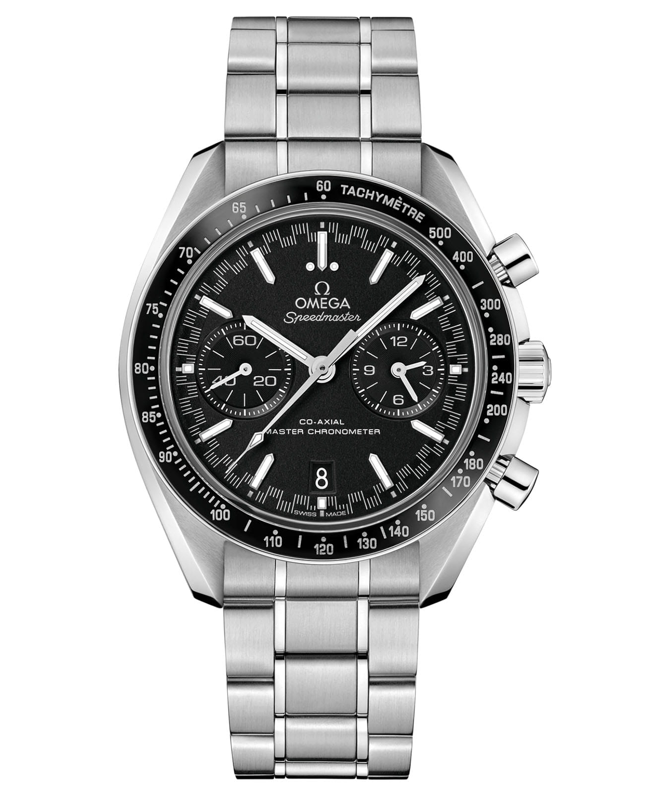 Speedmaster Racing Master Chronometer в 44,25-мм корпусе из нержавеющей стали с браслетом демонстрирует безупречное сочетание гоночной эстетики и часового мастерства. Черное керамическое кольцоБезельВнешний ободок, закрепляющий стекло. В спортивных часах так называется поворотное кольцо с делениями на циферблате, выполняет роль таймера – замеряет отрезки времени на шкале. Неподвижный безель – элемент декора. Однонаправленно вращающийся безель на дайверских часах позволяет фиксировать моменты погружения и выныривания на поверхность. с тахиметрической шкалойТахиметрРазмеченная шкала, располагается на ободке или безеле часов. Тахиметр позволяет рассчитать скорость на определённом участке пути, расстояние измеряется в километрах или милях. из инновационного Liquidmetal™ придает моделей неповторимый спортивный шарм. Черный циферблат с характерной "спидометрной" минутной шкалой украшен индексами из белого золота18-каратное золотоОбозначение по каратной системе пробирования, оно показывает, сколько драгоценного металла содержится в изделии. 18 карат - в составе 75% чистого золота, соответствует 750 пробе.