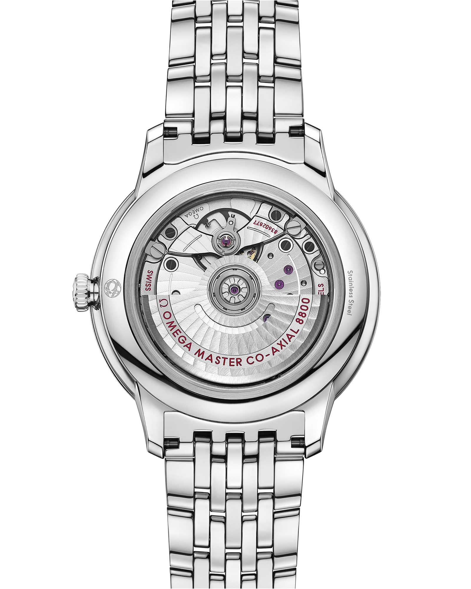 40-миллиметровый корпус из благородной стали гармонично сочетается с выпуклым циферблатом в PVD-покрытииPVDУльтратонкое покрытие наносится в технике вакуумного напыления, сочетает в себе нитрид титана особой прочности со слоем золота или оксида хрома. Несёт в себе декоративную или защитную функцию. глубокого ночного оттенка, украшенным изысканным вертикальным узором с радиальной шлифовкой. Стрелки с благородным родиевым блеском и чередующиеся римские цифры с кабошонами создают неповторимую игру света. Лаконичный дизайн дополняют практичные элементы: изящное окошко даты на позиции «6 часов» и минутная шкала в узнаваемом стиле «железная дорога» по периметру циферблата. Обладатель сертификата Master Chronometer, эти часы представлены с элегантным стальным браслетом. Сердце механизма - калибр OMEGA Master Co-Axial 8800, демонстрируемый через прочное сапфировое стеклоСапфировое стеклоПрочный и надёжный материал из кристалла сапфира синтетического происхождения, характеризующийся особой твёрдостью и устойчивостью к царапинам и повреждениям. задней крышки.
