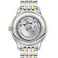 , а также чередующиеся римские цифры и индексы в форме кабошона. 270-градусный индикатор запаса хода расположен в положении "6 часов". Он имеет двухслойную конструкцию в форме полумесяца, состоящую из нижней пластины с изящной контрастной отделкой, выполненной в одной цветовой гамме, и верхней пластины с 4-я секторальными прорезями. Изделие с лаконичным дизайном дополнено окошком указателя даты в положении «6 часов», счетчиком малой секундной стрелки в положении «9 часов» и минутной шкалой в стиле «железная дорога» на внешнем секторе. Часы с сертификатом Master Chronometer представлены с браслетом из нержавеющей стали и желтого золота18-каратное золотоОбозначение по каратной системе пробирования, оно показывает, сколько драгоценного металла содержится в изделии. 18 карат - в составе 75% чистого золота, соответствует 750 пробе.