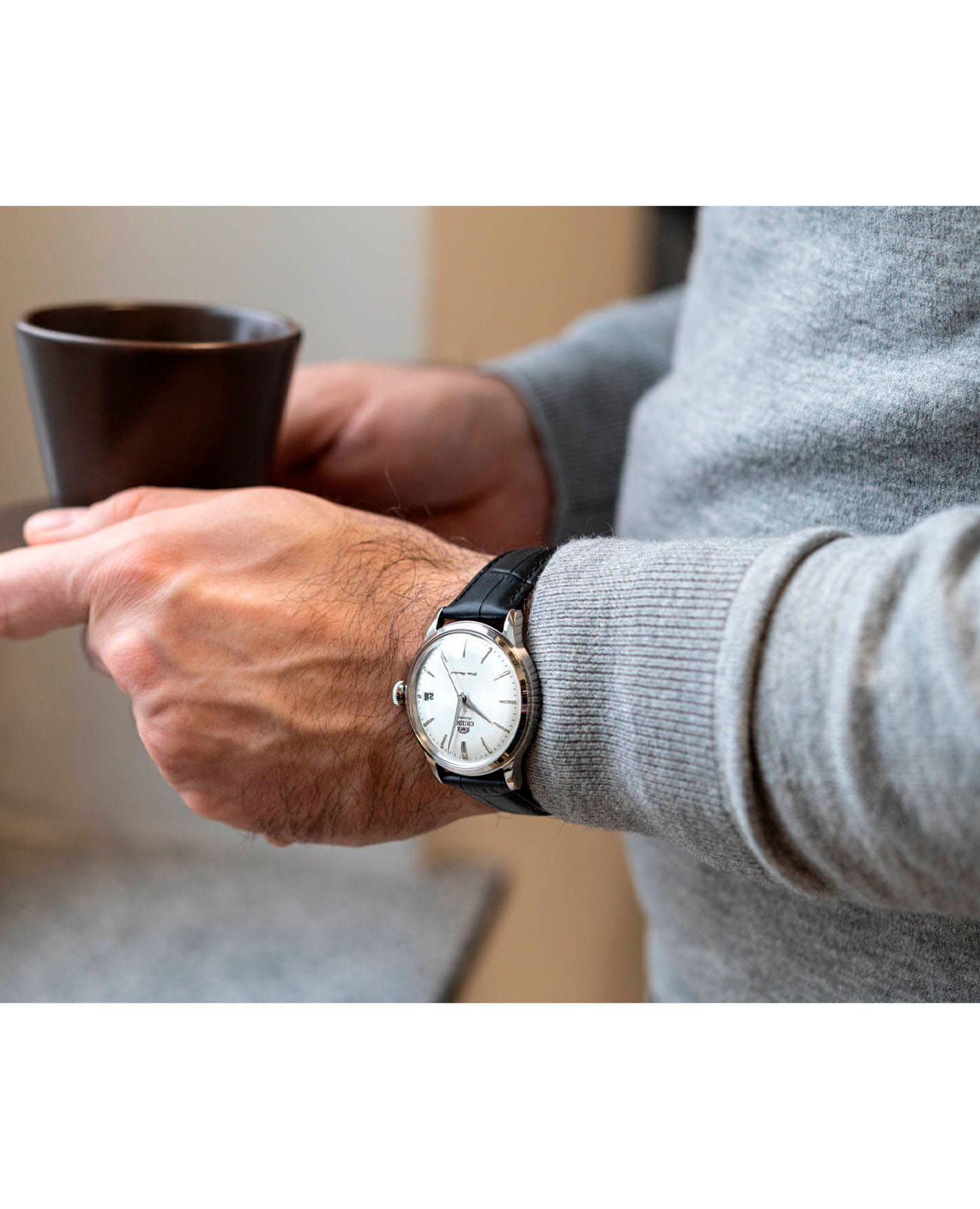 Часы оснащены кожаным ремешком черного цвета шириной 20 мм на стандартной застежке, который дополняет их классический стиль.