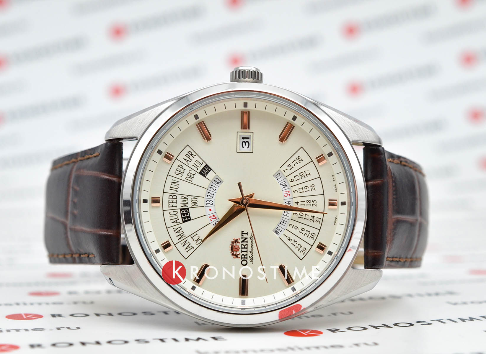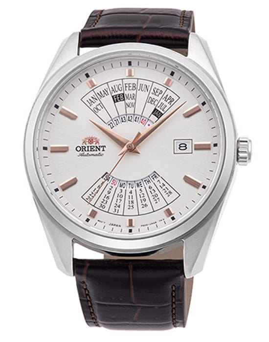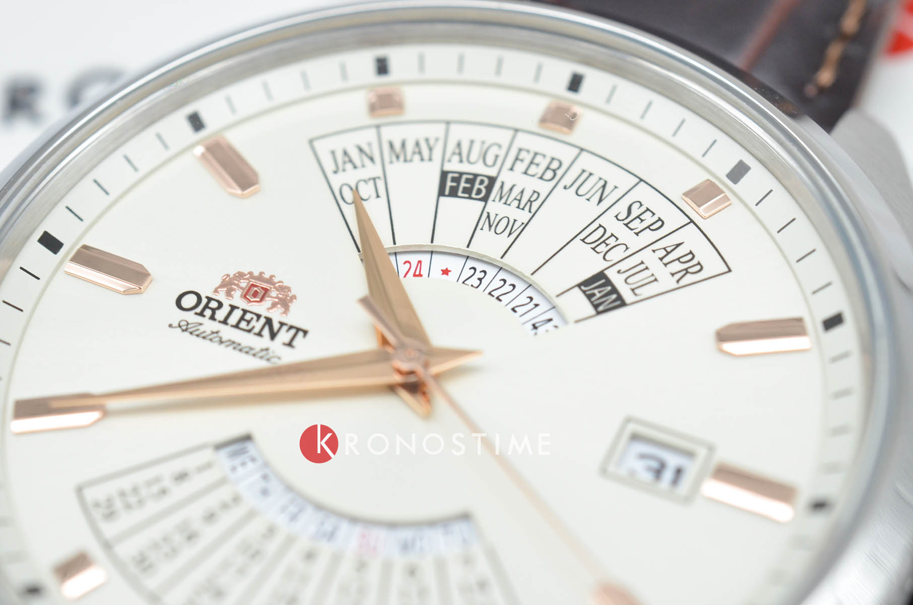 Orient RA‑BA0005S Multi‑Year Calendar — элегантная модель с выразительным дизайном и практичной функциональностью. Корпус диаметром 43,5 мм выполнен из нержавеющей стали с полированной поверхностью, придающей часам сдержанный и благородный облик.