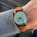 Многокомпонентный бронзовый корпус, стальная задняя крышка корпуса. Сапфировое стеклоСапфировое стеклоПрочный и надёжный материал из кристалла сапфира синтетического происхождения, характеризующийся особой твёрдостью и устойчивостью к царапинам и повреждениям., выпуклое с обеих сторон, внутреннее антибликовое покрытие. Нержавеющая сталь, завинчивающаяся прозрачная задняя крышка из минерального стеклаМинеральное стеклоМинеральное стекло представляет собой искусственно выращенный минерал кварца. Такое стекло отличается особой устойчивостью к повреждениям и царапинам. Уступает по некоторым качествам сапфировому стеклу.. Стрелки с люминесцентным покрытиемЛюминесцентное покрытиеПозволяет считывать показания времени в темноте. Производители наносят на стрелки, часовые индексы, безель или поверхность циферблата светонакопительный состав, дающий холодное свечение.. Кожаный ремень.