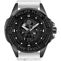Эти необычные часы, воплощающие в себе уникальное сочетание узнаваемости бренда и непредсказуемости, каждый день будут напоминать вам о том, что нет таких целей, которых вы не смогли бы достичь. Мужские часы с японским кварцевым механизмом. Стальной корпус с чёрным IP-покрытиемIP-покрытиеМетод ионного напыления. Демонстрирует повышенную устойчивость к истиранию, окислению и химическим веществам. Под воздействием высокого давления и температуры около 1500°C молекулы металла надёжно соединяются с частицами корпуса часов.. БезельБезельВнешний ободок, закрепляющий стекло. В спортивных часах так называется поворотное кольцо с делениями на циферблате, выполняет роль таймера – замеряет отрезки времени на шкале. Неподвижный безель – элемент декора. Однонаправленно вращающийся безель на дайверских часах позволяет фиксировать моменты погружения и выныривания на поверхность. украшен шестиугольными логотипами бренда, расположенными симметрично слева и справа, сверху украшен символичным логотипом Philipp Plein, а снизу украшен названием коллекции ''The Skull''. Метки в виде штрихов. Высокопрочное минеральное стеклоМинеральное стеклоМинеральное стекло представляет собой искусственно выращенный минерал кварца. Такое стекло отличается особой устойчивостью к повреждениям и царапинам. Уступает по некоторым качествам сапфировому стеклу.. Граненая заводная головка с защитой. Белый силиконовый ремешок с классической застежкой украшен объемным черепом и стальной вставкой. Фирменная дизайнерская упаковка.