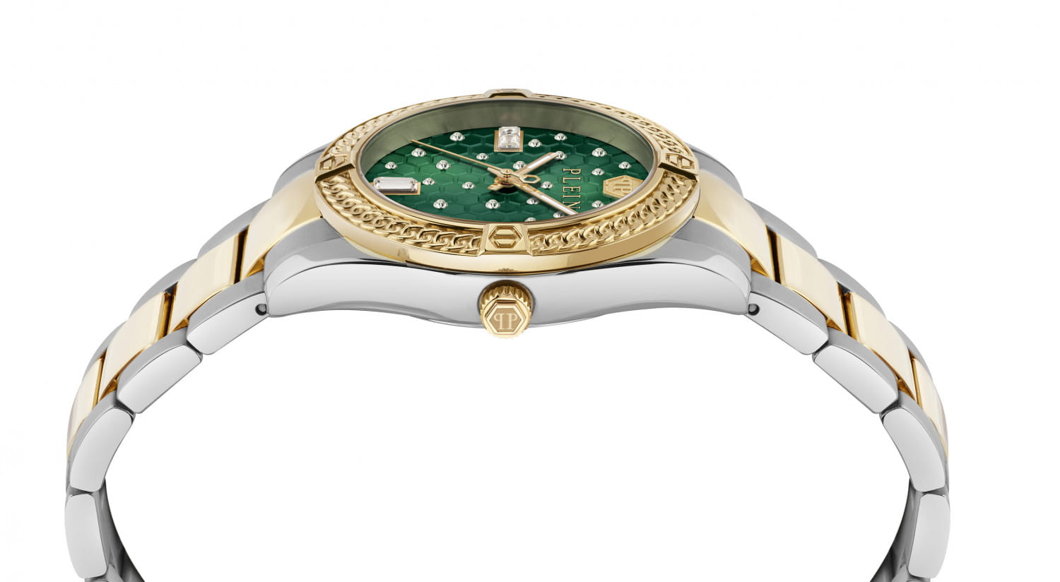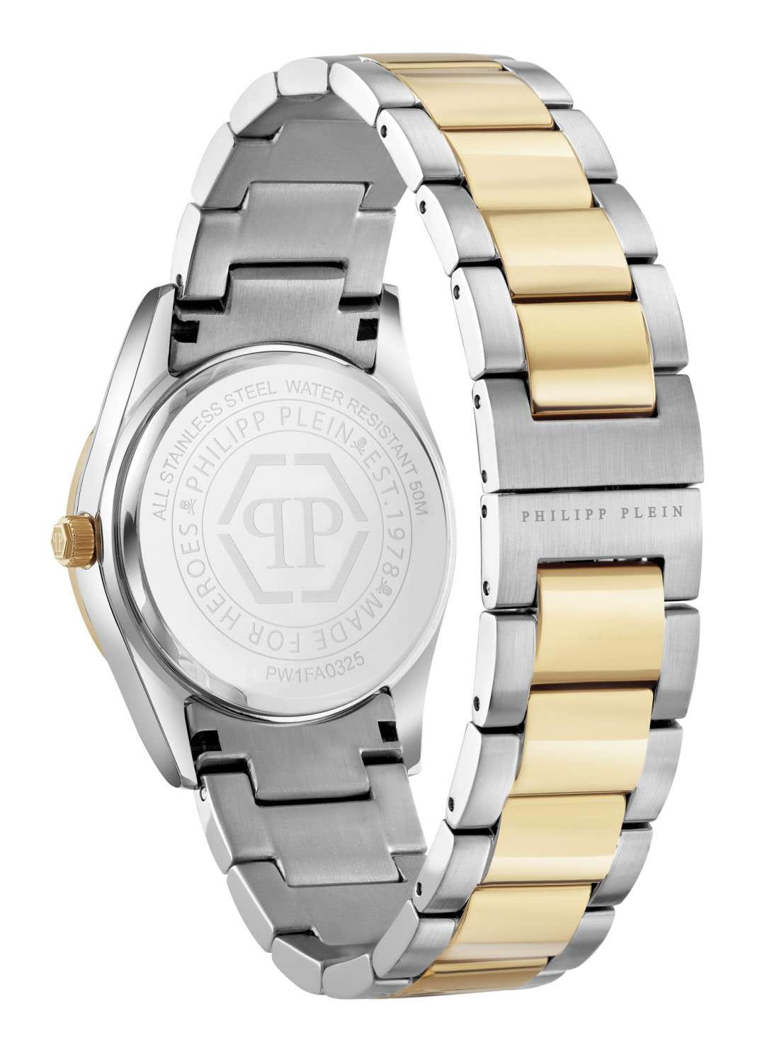 Женские кварцевые часы Philipp Plein Plein Icon Chain PW1FA0325 — это стильное сочетание элегантности и современного дизайна. Изящный корпус выполнен из нержавеющей стали, диаметром 36 мм, что придаст образу женственности и романтизма. Изысканный циферблат с метками в виде штрихов придает модели особый блеск. Циферблат защищен минеральным стекломМинеральное стеклоМинеральное стекло представляет собой искусственно выращенный минерал кварца. Такое стекло отличается особой устойчивостью к повреждениям и царапинам. Уступает по некоторым качествам сапфировому стеклу., обеспечивающий устойчивость к царапинам и украшен кристаллами. Стрелки с люминесцентным покрытиемЛюминесцентное покрытиеПозволяет считывать показания времени в темноте. Производители наносят на стрелки, часовые индексы, безель или поверхность циферблата светонакопительный состав, дающий холодное свечение.. БезельБезельВнешний ободок, закрепляющий стекло. В спортивных часах так называется поворотное кольцо с делениями на циферблате, выполняет роль таймера – замеряет отрезки времени на шкале. Неподвижный безель – элемент декора. Однонаправленно вращающийся безель на дайверских часах позволяет фиксировать моменты погружения и выныривания на поверхность. с PVD-покрытиемPVDУльтратонкое покрытие наносится в технике вакуумного напыления, сочетает в себе нитрид титана особой прочности со слоем золота или оксида хрома. Несёт в себе декоративную или защитную функцию. золотистого цвета. Часы оснащены надежным кварцевым механизмом. Стальной браслет с частичным PVD-покрытиемPVDУльтратонкое покрытие наносится в технике вакуумного напыления, сочетает в себе нитрид титана особой прочности со слоем золота или оксида хрома. Несёт в себе декоративную или защитную функцию. на застёжке-бабочкеЗастёжка "бабочка"Такой вид застёжки дополняется предохранителями, помогающими избежать случайного раскрытия браслета. Обладают изящным исполнением. , гарантирует комфортное и безопасное ношение. Класс водозащиты: 50 метров позволит защитить корпус от случайных брызг или капель дождя. Phlipp Plein — отличный выбор для тех, кто ценит яркость и качество.