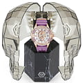 Яркие женские часы с минеральным стекломМинеральное стеклоМинеральное стекло представляет собой искусственно выращенный минерал кварца. Такое стекло отличается особой устойчивостью к повреждениям и царапинам. Уступает по некоторым качествам сапфировому стеклу. Philipp Plein The Skull PWNAA0222, кварцевый механизм с высокой точностью. Класс водозащиты: 50 метров, позволит защитить корпус от случайных брызг или капель дождя. Корпус часов изготовлен из стали с IP-покрытиемIP-покрытиеМетод ионного напыления. Демонстрирует повышенную устойчивость к истиранию, окислению и химическим веществам. Под воздействием высокого давления и температуры около 1500°C молекулы металла надёжно соединяются с частицами корпуса часов.. Круглый стальной корпус украшен кристаллами Swarovski. Циферблат с метками в виде точек украшенных кристаллами Swarovski, дополнен трехмерным граненым черепом. Шестигранная заводная головка с защитой. Силиконовый ремешок украшен объемным черепом и стальной вставкой.