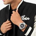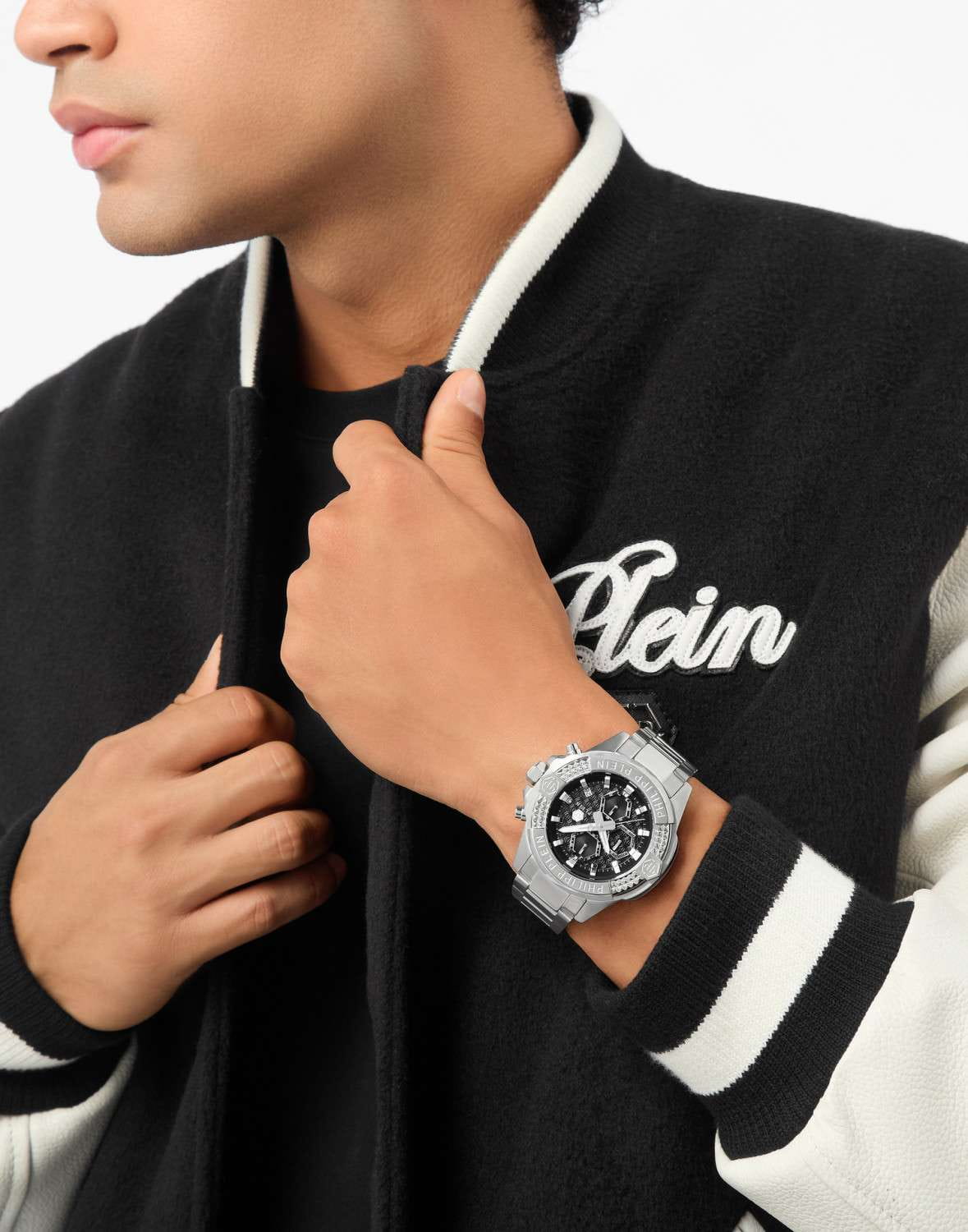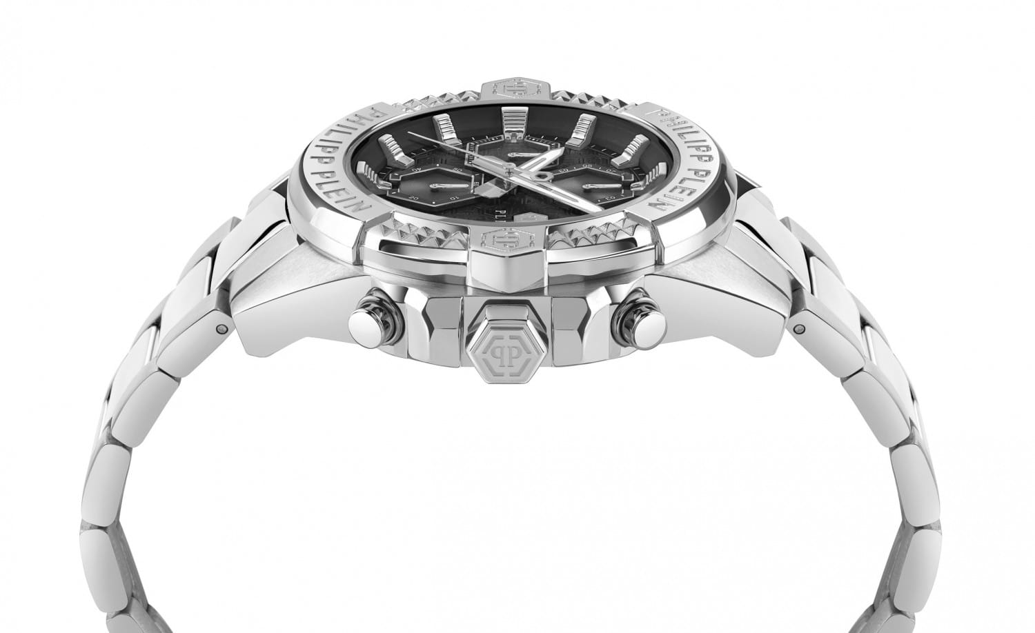 Philipp Plein The $kull Chrono PWWFA0425 - яркие часы-хронографХронографФункция позволяет измерять отрезки времени с особой точностью: часы, минуты, секунды. Верным признаком хронографа является наличие на циферблате 3 дополнительных окошек-счётчиков. в революционном дизайне несомненно добавят вам выразительности и станут главным акцентом вашего стильного образа. Мужские кварцевые часы с высокой точностью. Круглый стальной корпус серебристого цвета, диаметром 44 мм. Метки в виде штрихов. Минеральное стеклоМинеральное стеклоМинеральное стекло представляет собой искусственно выращенный минерал кварца. Такое стекло отличается особой устойчивостью к повреждениям и царапинам. Уступает по некоторым качествам сапфировому стеклу. защищает циферблат от царапин. Люминесцентное покрытиеЛюминесцентное покрытиеПозволяет считывать показания времени в темноте. Производители наносят на стрелки, часовые индексы, безель или поверхность циферблата светонакопительный состав, дающий холодное свечение. стрелок и меток позволит следить за временем даже в полной темноте. Окошко даты находится в положении 4 часа. Стальной браслет на застёжке-бабочке с кнопкамиЗастёжка "бабочка"Такой вид застёжки дополняется предохранителями, помогающими избежать случайного раскрытия браслета. Обладают изящным исполнением. , обеспечивает комфортное ношение. Граненая заводная головка. Влагозащита: 50 метров, позволит защитить корпус от случайных брызг или капель дождя. Идеальный аксессуар для тех, кто ценит индивидуальность и не боится выделяться из толпы.