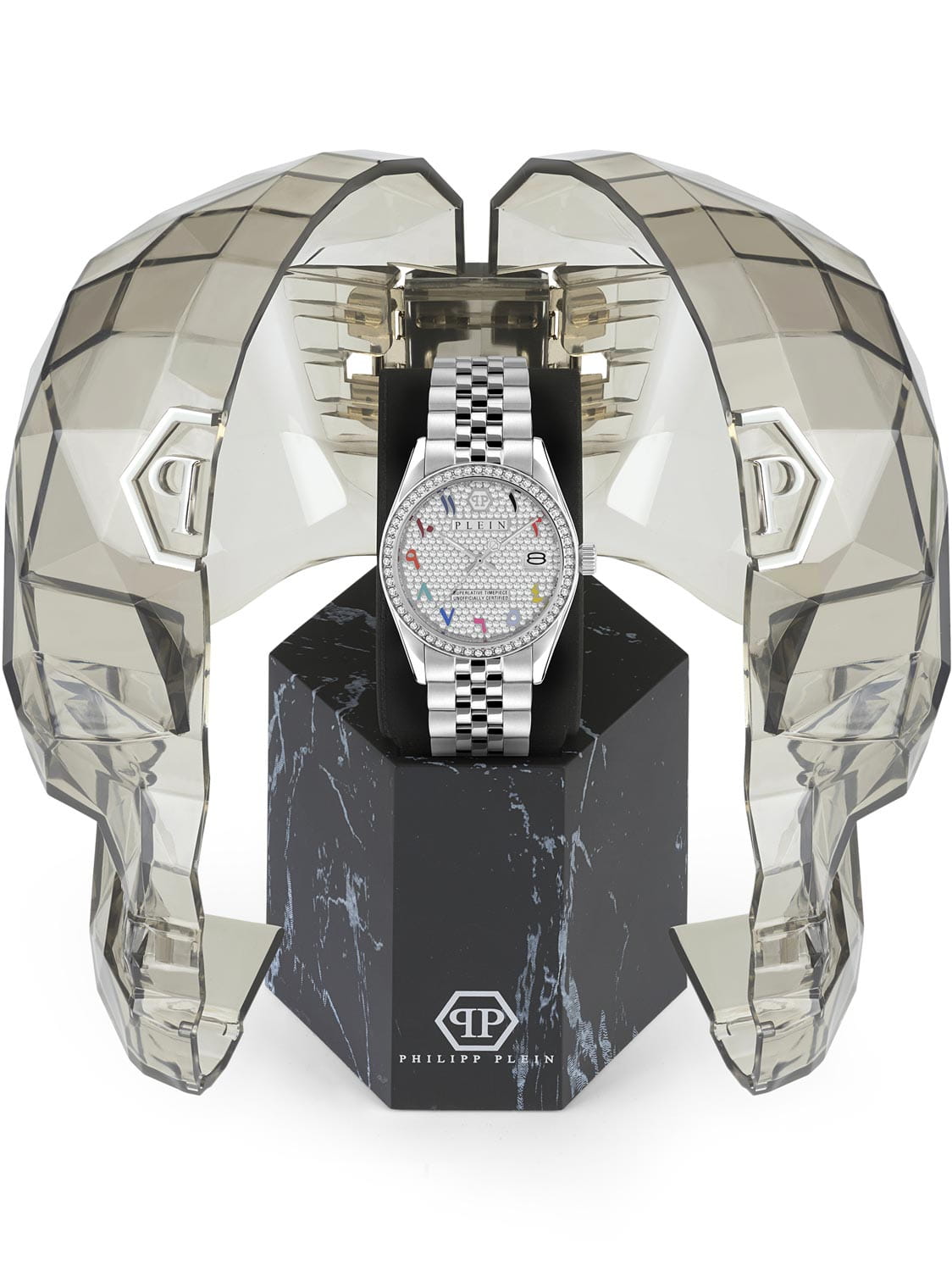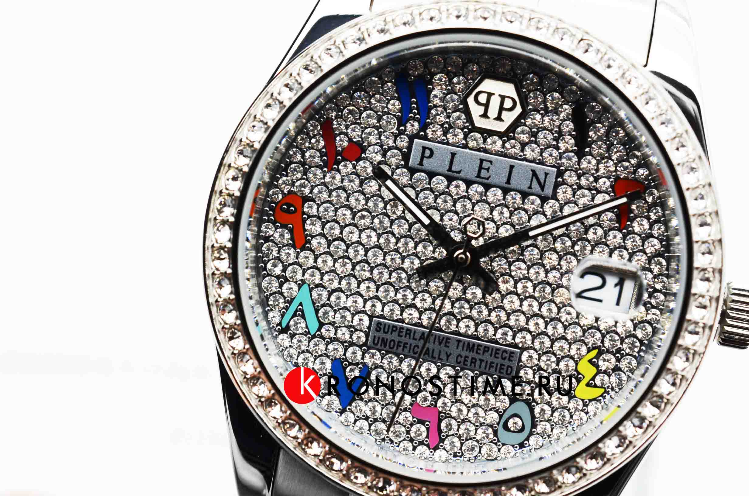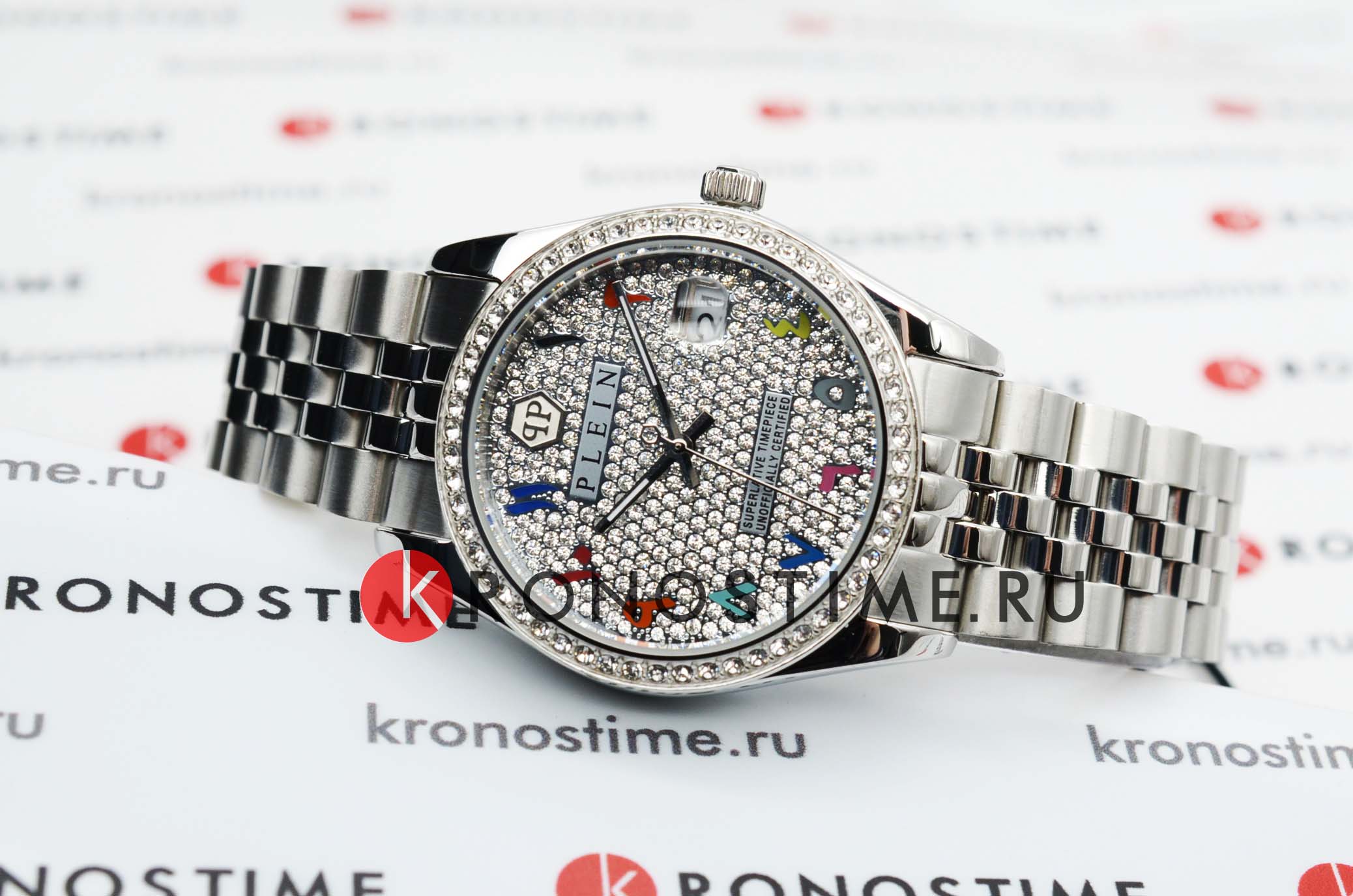 Яркие женские часы Philipp Plein Date Superlative PWYAA0723 c с минеральным стекломМинеральное стеклоМинеральное стекло представляет собой искусственно выращенный минерал кварца. Такое стекло отличается особой устойчивостью к повреждениям и царапинам. Уступает по некоторым качествам сапфировому стеклу.. Особенные часы для особенных женщин! Ослепительный аксессуар, демонстрирующий роскошь и изысканность.Часы с круглым стальным корпусом. Перламутровый циферблат с метками в виде точек, украшенных кристаллами. Люминесцентное покрытиеЛюминесцентное покрытиеПозволяет считывать показания времени в темноте. Производители наносят на стрелки, часовые индексы, безель или поверхность циферблата светонакопительный состав, дающий холодное свечение. стрелок. Окошко даты с увеличительным стеклом находится в положении 3 часа. Рифленая заводная головка. Стальной браслет на застёжке бабочка с кнопкамиЗастёжка "бабочка"Такой вид застёжки дополняется предохранителями, помогающими избежать случайного раскрытия браслета. Обладают изящным исполнением.