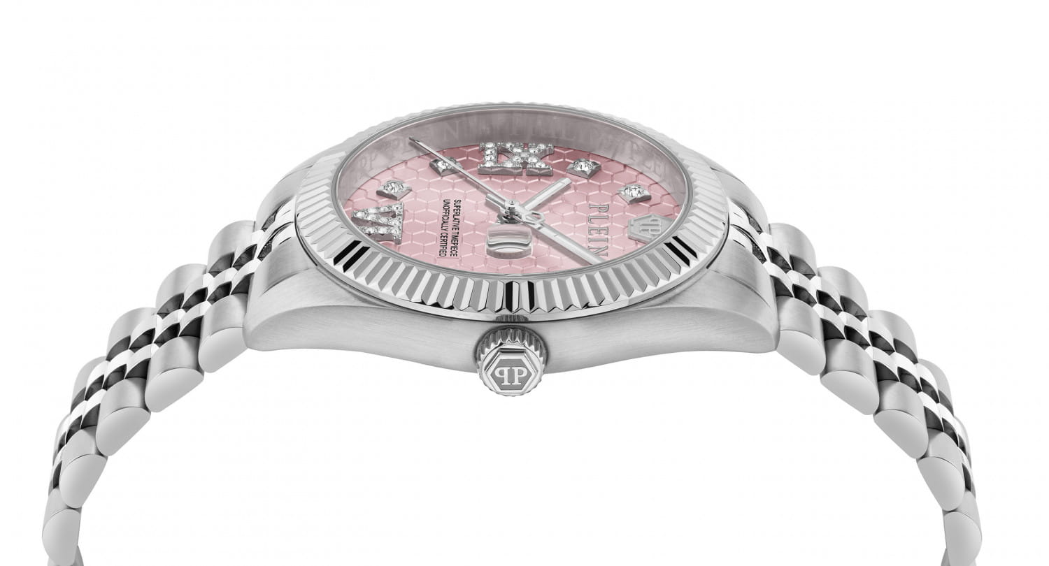 Женские кварцевые часы Philipp Plein Date Superlative PWYFA0125 — это стильное сочетание элегантности и современного дизайна. Изящный корпус выполнен из нержавеющей стали, диаметром 34 мм, что придаст образу женственности и романтизма. Изысканный циферблат с метками в виде точек придает модели особый блеск. Циферблат защищен минеральным стекломМинеральное стеклоМинеральное стекло представляет собой искусственно выращенный минерал кварца. Такое стекло отличается особой устойчивостью к повреждениям и царапинам. Уступает по некоторым качествам сапфировому стеклу., обеспечивающий устойчивость к царапинам и украшен кристаллами. Стрелки с люминесцентным покрытиемЛюминесцентное покрытиеПозволяет считывать показания времени в темноте. Производители наносят на стрелки, часовые индексы, безель или поверхность циферблата светонакопительный состав, дающий холодное свечение.. Часы оснащены надежным кварцевым механизмом. Окошко даты находится в положении 3 часа. Стальной браслет на застёжке-бабочкеЗастёжка "бабочка"Такой вид застёжки дополняется предохранителями, помогающими избежать случайного раскрытия браслета. Обладают изящным исполнением. , гарантирует комфортное и безопасное ношение. Класс водозащиты: 50 метров позволит защитить корпус от случайных брызг или капель дождя. Phlipp Plein — отличный выбор для тех, кто ценит яркость и качество.