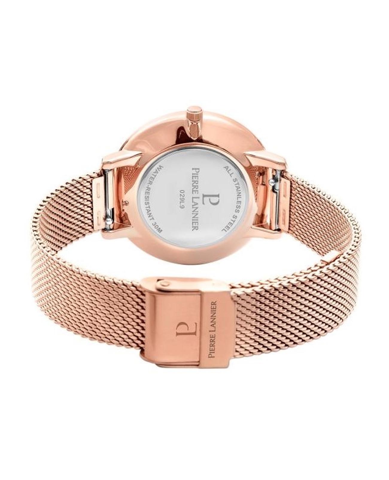 Женские часы Pierre Lannier Ocean 029L998, кварцевый механизм с высокой точностью. Прочное минеральное стеклоМинеральное стеклоМинеральное стекло представляет собой искусственно выращенный минерал кварца. Такое стекло отличается особой устойчивостью к повреждениям и царапинам. Уступает по некоторым качествам сапфировому стеклу., устойчивое к мелким механическим повреждениям. Круглый корпус выполнен из нержавеющей стали с IP-покрытиемIP-покрытиеМетод ионного напыления. Демонстрирует повышенную устойчивость к истиранию, окислению и химическим веществам. Под воздействием высокого давления и температуры около 1500°C молекулы металла надёжно соединяются с частицами корпуса часов.. Перламутровый циферблат украшает уникальное изображение глаза Сент-Люсии. Центральные часовая и минутная стрелки. Класс водозащиты: 30 метров, позволит защитить корпус от случайных брызг или капель дождя. Стальной браслет миланского плетения с IP-покрытиемIP-покрытиеМетод ионного напыления. Демонстрирует повышенную устойчивость к истиранию, окислению и химическим веществам. Под воздействием высокого давления и температуры около 1500°C молекулы металла надёжно соединяются с частицами корпуса часов. на раскладном замкеРаскладной замокДанный вариант застежки используется только на часах с металлическим браслетом. Отличительная особенность такого крепления в том, что длина браслета становится универсальной и вы можете самостоятельно отрегулировать нужный вам размер – застежка просто двигается по браслету часов..