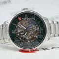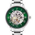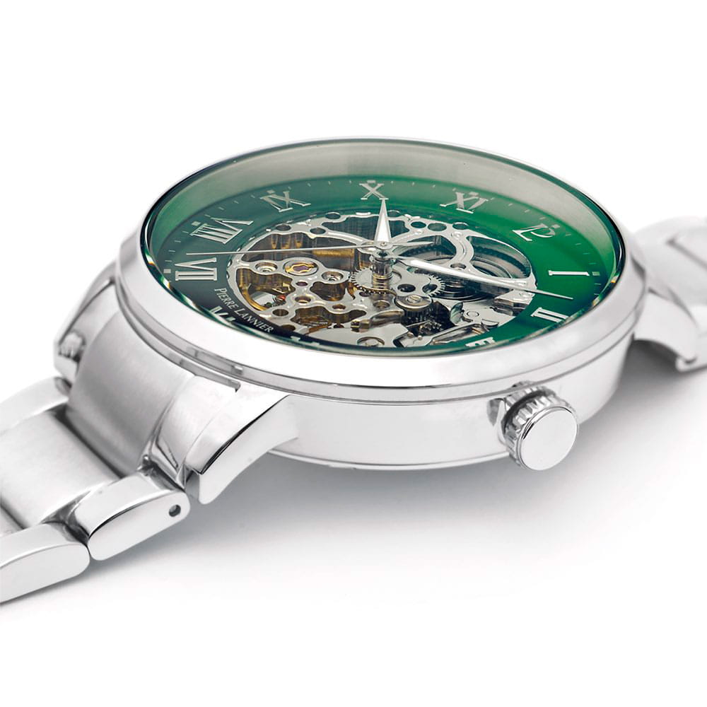 Мужские механические часы с автоподзаводом Pierre Lannier Automatic 317B171. Минеральное стеклоМинеральное стеклоМинеральное стекло представляет собой искусственно выращенный минерал кварца. Такое стекло отличается особой устойчивостью к повреждениям и царапинам. Уступает по некоторым качествам сапфировому стеклу. устойчивое к мелким механическим повреждениям. Центральные часовая, минутная и секундная стрелки. Корпус и браслет выполнены из нержавеющей стали. Водостойкость: 50 метров, позволит защитить корпус от случайных брызг или капель дождя. Стрелки с люминесцентным покрытиемЛюминесцентное покрытиеПозволяет считывать показания времени в темноте. Производители наносят на стрелки, часовые индексы, безель или поверхность циферблата светонакопительный состав, дающий холодное свечение.. Зеленый скелетонизированный циферблат. Удобный стальной браслет на раскладной застёжкеРаскладная застёжкаТакой тип застёжки используется только на браслетах из металла. Она никогда не раскрывается полностью, происходит разделение на 2 и более частей. Раскладывающая застёжка снизит вероятность потери часов к минимуму.. Прозрачная задняя крышка.