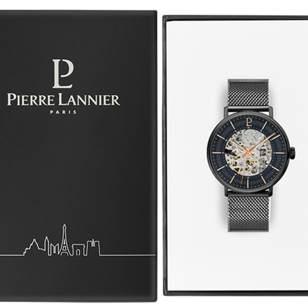 Мужские механические часы с автоподзаводом Pierre Lannier Gaius 324C439. Минеральное стеклоМинеральное стеклоМинеральное стекло представляет собой искусственно выращенный минерал кварца. Такое стекло отличается особой устойчивостью к повреждениям и царапинам. Уступает по некоторым качествам сапфировому стеклу. устойчивое к мелким механическим повреждениям. Центральные часовая, минутная и секундная стрелки. Корпус и браслет выполнен из нержавеющей стали с IP-покрытиемIP-покрытиеМетод ионного напыления. Демонстрирует повышенную устойчивость к истиранию, окислению и химическим веществам. Под воздействием высокого давления и температуры около 1500°C молекулы металла надёжно соединяются с частицами корпуса часов.. Водостойкость: 50 метров, позволит защитить корпус от случайных брызг или капель дождя. Браслет миланского плетения с раскладной застёжкойРаскладная застёжкаТакой тип застёжки используется только на браслетах из металла. Она никогда не раскрывается полностью, происходит разделение на 2 и более частей. Раскладывающая застёжка снизит вероятность потери часов к минимуму.. Стрелки с люминесцентным покрытиемЛюминесцентное покрытиеПозволяет считывать показания времени в темноте. Производители наносят на стрелки, часовые индексы, безель или поверхность циферблата светонакопительный состав, дающий холодное свечение.. Прозрачная задняя крышка.