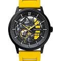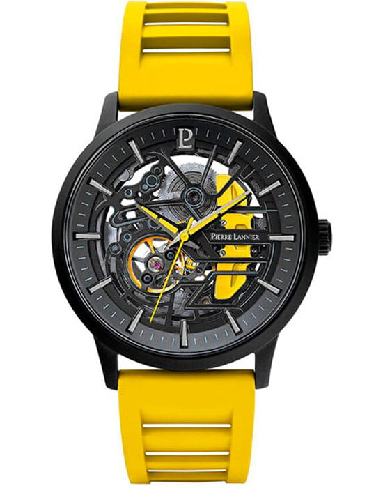 Pierre Lannier Paddock 341A449 — смелая и энергичная модель, вдохновлённая миром мотоспорта. Корпус диаметром 43 мм выполнен из нержавеющей стали с матовым чёрным PVD-покрытиемPVDУльтратонкое покрытие наносится в технике вакуумного напыления, сочетает в себе нитрид титана особой прочности со слоем золота или оксида хрома. Несёт в себе декоративную или защитную функцию., которое подчёркивает спортивный и технический характер часов. Циферблат частично скелетонизирован — открывает взгляд на работу баланса и других элементов механизма. Яркие жёлтые акценты на стрелках и декоративных вставках добавляют динамики и визуальной выразительности, напоминая детали гоночного оборудования. Стрелки и часовые метки покрыты люминесцентным покрытиемЛюминесцентное покрытиеПозволяет считывать показания времени в темноте. Производители наносят на стрелки, часовые индексы, безель или поверхность циферблата светонакопительный состав, дающий холодное свечение., обеспечивая отличную читаемость в тёмное время суток. Циферблат надёжно защищён минеральным стекломМинеральное стеклоМинеральное стекло представляет собой искусственно выращенный минерал кварца. Такое стекло отличается особой устойчивостью к повреждениям и царапинам. Уступает по некоторым качествам сапфировому стеклу., устойчивым к царапинам и механическим воздействиям. Модель оснащена автоматическим механизмом с автоподзаводом и запасом хода около 42 часов, что позволяет использовать часы без необходимости ежедневного подзавода. Ярко-жёлтый перфорированный кожаный ремешок шириной 20 мм завершён удобной стандартной застежкой, обеспечивающей надёжную посадку и лёгкость в использовании. Водозащита до 5 ATM (50 м) делает часы устойчивыми к дождю и брызгам, подходящими для повседневной носки. Paddock — это смелое заявление, в котором сочетаются техническая выразительность, спортивная энергия и характерный стиль.