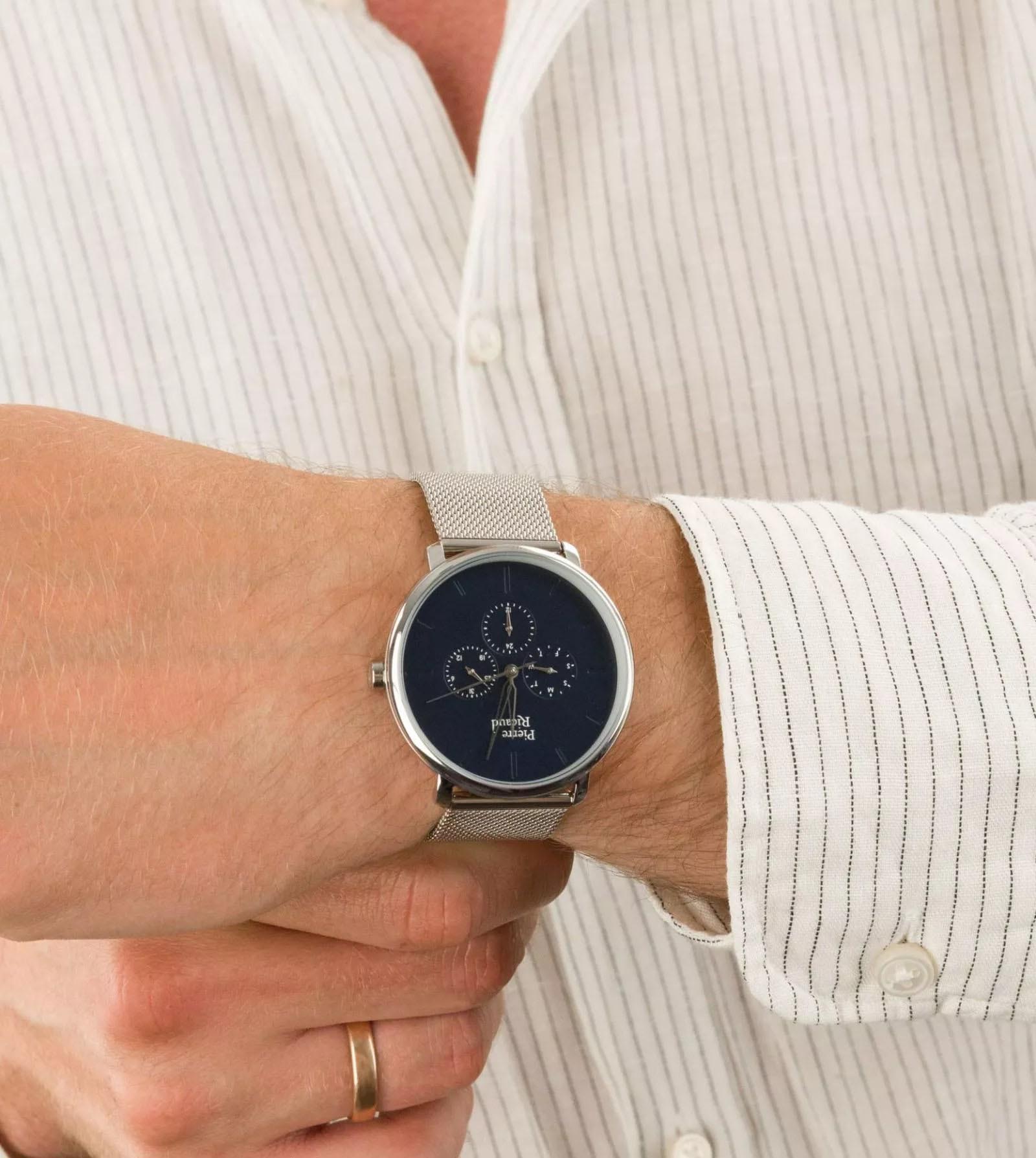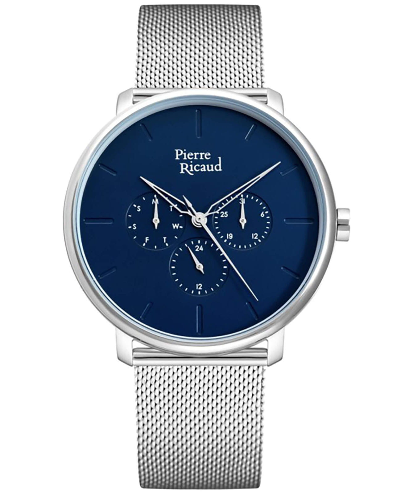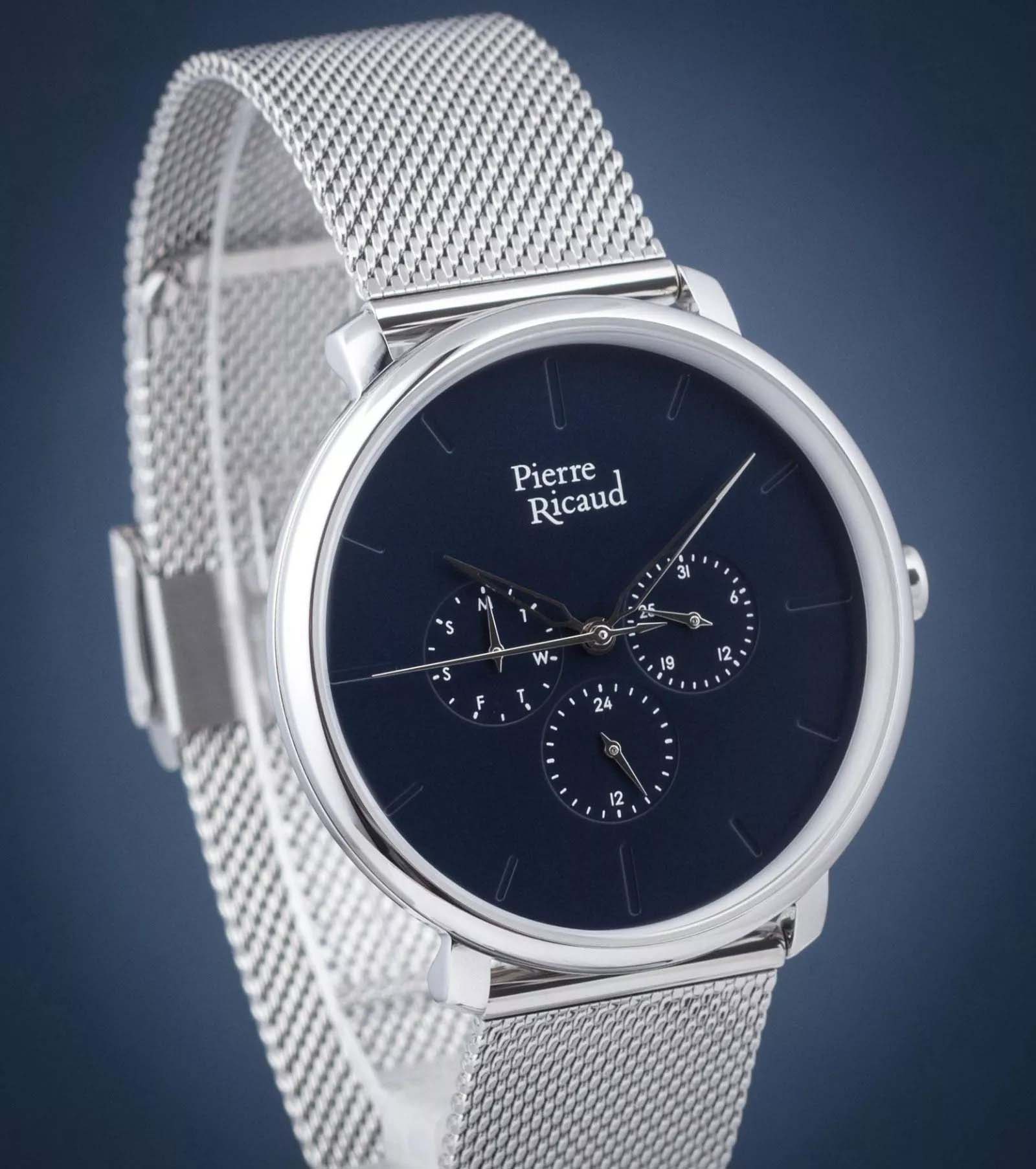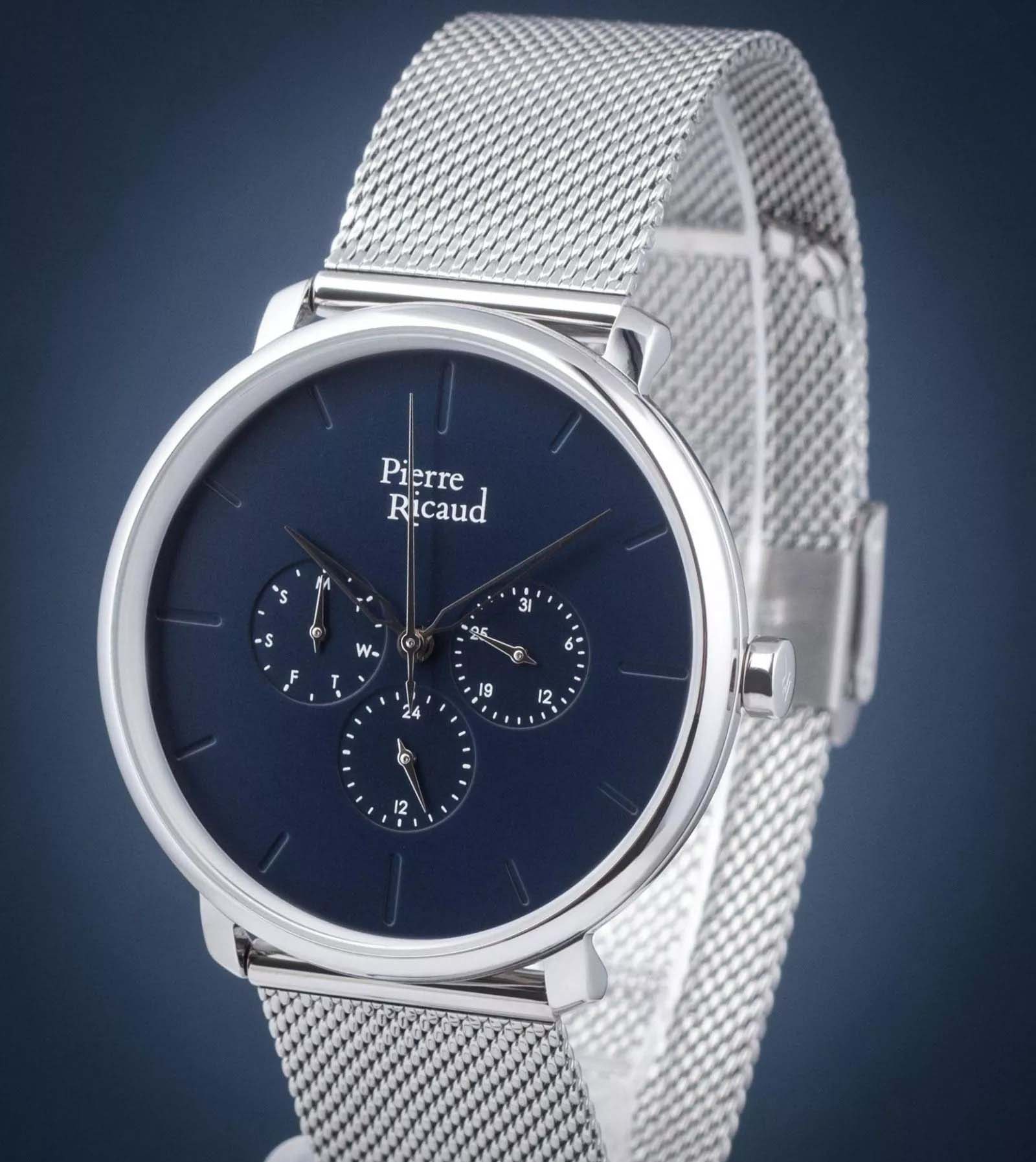 Мужские часы с минеральным стекломМинеральное стеклоМинеральное стекло представляет собой искусственно выращенный минерал кварца. Такое стекло отличается особой устойчивостью к повреждениям и царапинам. Уступает по некоторым качествам сапфировому стеклу. Pierre Ricaud P97169.5115QF, кварцевый механизм с высокой точностью. Класс водозащиты: 50 метров, позволит защитить корпус от случайных брызг или капель дождя. Корпус часов изготовлен из стали. Стальной браслет на раскладной застёжкеРаскладная застёжкаТакой тип застёжки используется только на браслетах из металла. Она никогда не раскрывается полностью, происходит разделение на 2 и более частей. Раскладывающая застёжка снизит вероятность потери часов к минимуму.. Дата, день недели, 24-часовой указатель времени.