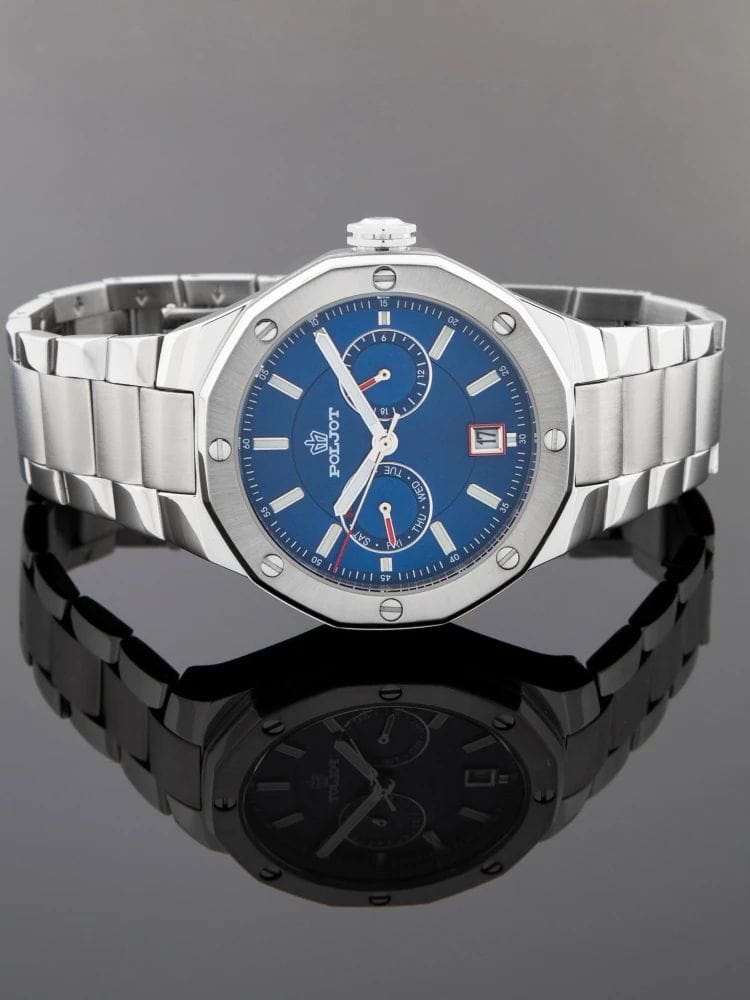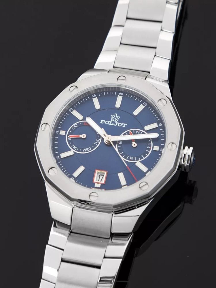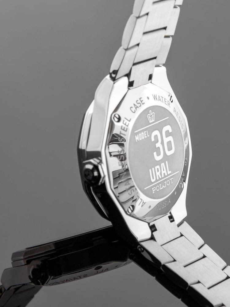 Poljot Ural JP21.361266Б — стильные кварцевые часы, сочетающие брутальный характер и современную элегантность. Корпус выполнен из нержавеющей стали, что придаёт модели монолитность и прочность, а глубокий циферблат подчеркивает премиальный облик. Стальной браслет на застёжке-бабочке с кнопкамиЗастёжка "бабочка"Такой вид застёжки дополняется предохранителями, помогающими избежать случайного раскрытия браслета. Обладают изящным исполнением. . Внутри установлен надёжный кварцевый механизм, обеспечивающий точный ход и плавную работу стрелок. Широкие метки и стрелки с люминесцентным покрытиемЛюминесцентное покрытиеПозволяет считывать показания времени в темноте. Производители наносят на стрелки, часовые индексы, безель или поверхность циферблата светонакопительный состав, дающий холодное свечение. гарантируют превосходную читаемость в любое время суток, а окно даты добавляет удобства. Прочное минеральное стеклоМинеральное стеклоМинеральное стекло представляет собой искусственно выращенный минерал кварца. Такое стекло отличается особой устойчивостью к повреждениям и царапинам. Уступает по некоторым качествам сапфировому стеклу. защищает циферблат от повреждений, а водонепроницаемость до 10 бар делает часы надёжным спутником как в деловом, так и активном образе жизни. Poljot Ural — воплощение силы, точности и мужского стиля, созданное для тех, кто ценит механику и уверенность в каждой детали.