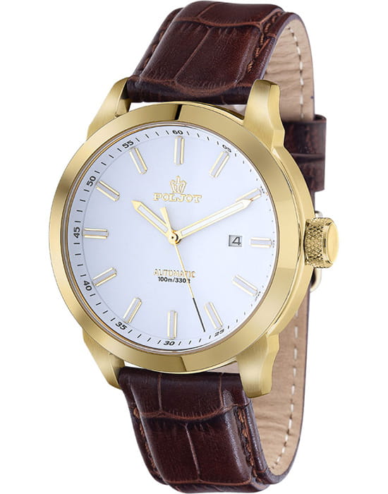 Poljot 8215.746036 — элегантные механические мужские часы с автоподзаводом, сочетающие традиции отечественного часового производства и классический дизайн. Корпус из нержавеющей стали с тёплым золотистым с PVD-покрытиемPVDУльтратонкое покрытие наносится в технике вакуумного напыления, сочетает в себе нитрид титана особой прочности со слоем золота или оксида хрома. Несёт в себе декоративную или защитную функцию. придаёт модели благородный характер, а белый циферблат с чёткой разметкой и аккуратным окном даты на позиции «3 часа» подчёркивает функциональную строгость стиля. Надёжный механизм с автоподзаводом обеспечивает плавный ход стрелок и стабильную работу. Прочное минеральное стеклоМинеральное стеклоМинеральное стекло представляет собой искусственно выращенный минерал кварца. Такое стекло отличается особой устойчивостью к повреждениям и царапинам. Уступает по некоторым качествам сапфировому стеклу. защищает циферблат от повреждений, а ремешок из натуральной кожи с классической пряжкой добавляет образу утончённости и комфорта. Poljot — это воплощение надёжности, традиции и сдержанной элегантности, идеально подходящее для повседневного делового стиля.
