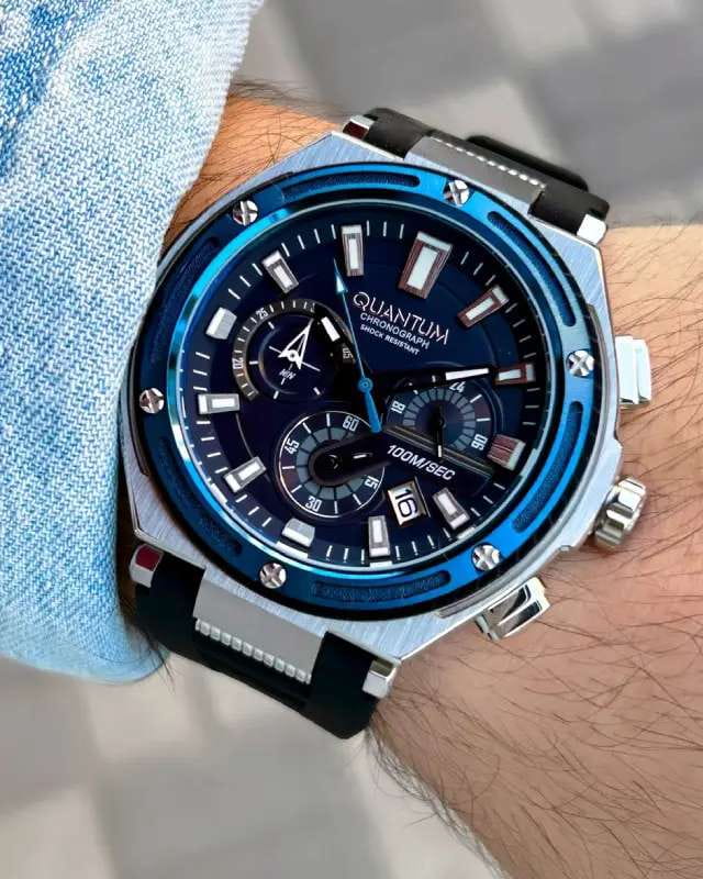 Мужские кварцевые часы Quantum HNG1010.391 из коллекции Hunter — крупные, надёжные и функциональные спортивные часы в классическом исполнении. Корпус круглый, из нержавеющей стали, диаметром 50 мм. Циферблат синий со штриховыми метками, с функциями хронографаХронографФункция позволяет измерять отрезки времени с особой точностью: часы, минуты, секунды. Верным признаком хронографа является наличие на циферблате 3 дополнительных окошек-счётчиков. и окошком даты. БезельБезельВнешний ободок, закрепляющий стекло. В спортивных часах так называется поворотное кольцо с делениями на циферблате, выполняет роль таймера – замеряет отрезки времени на шкале. Неподвижный безель – элемент декора. Однонаправленно вращающийся безель на дайверских часах позволяет фиксировать моменты погружения и выныривания на поверхность. с PVD-покрытиемPVDУльтратонкое покрытие наносится в технике вакуумного напыления, сочетает в себе нитрид титана особой прочности со слоем золота или оксида хрома. Несёт в себе декоративную или защитную функцию. синий. Стекло — минеральноеМинеральное стеклоМинеральное стекло представляет собой искусственно выращенный минерал кварца. Такое стекло отличается особой устойчивостью к повреждениям и царапинам. Уступает по некоторым качествам сапфировому стеклу. с антибликовым покрытием. Механизм — японский кварцевый Seiko. Корпус — ударопрочныйУдаропрочный корпусМеханизм заключён в корпус, выполненный из современных материалов, устойчивых к ударам, механическим повреждениям и падению с высоты: инновационный пластик, карбон, нержавеющая сталь, титан.. Водонепроницаемость 100 м. Ремешок — чёрный каучуковый на стандартной застёжке. Идеальный выбор для тех, кто ценит турецкий дизайн и повседневную надёжность.