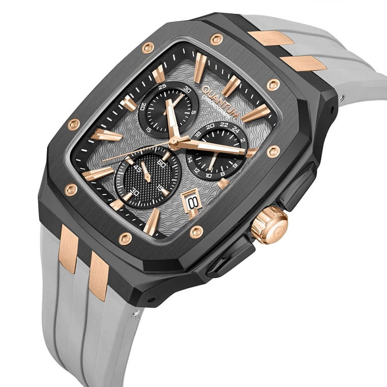 Мужские кварцевые часы Quantum из коллекции Hunter — стильный прямоугольный акцент с функциональным хронографом. Корпус прямоугольный, из нержавеющей стали с PVD-покрытиемPVDУльтратонкое покрытие наносится в технике вакуумного напыления, сочетает в себе нитрид титана особой прочности со слоем золота или оксида хрома. Несёт в себе декоративную или защитную функцию., размером 44 мм. Циферблат — серый с функциями хронографаХронографФункция позволяет измерять отрезки времени с особой точностью: часы, минуты, секунды. Верным признаком хронографа является наличие на циферблате 3 дополнительных окошек-счётчиков. и даты. Стекло — минеральноеМинеральное стеклоМинеральное стекло представляет собой искусственно выращенный минерал кварца. Такое стекло отличается особой устойчивостью к повреждениям и царапинам. Уступает по некоторым качествам сапфировому стеклу. с антибликовым покрытием. Механизм — японский кварцевый Seiko. Водонепроницаемость 100 м. Ремешок — серый силиконовый на стандартной застёжке. Идеальный выбор для тех, кто ценит турецкий дизайн и современный спортивный стиль.