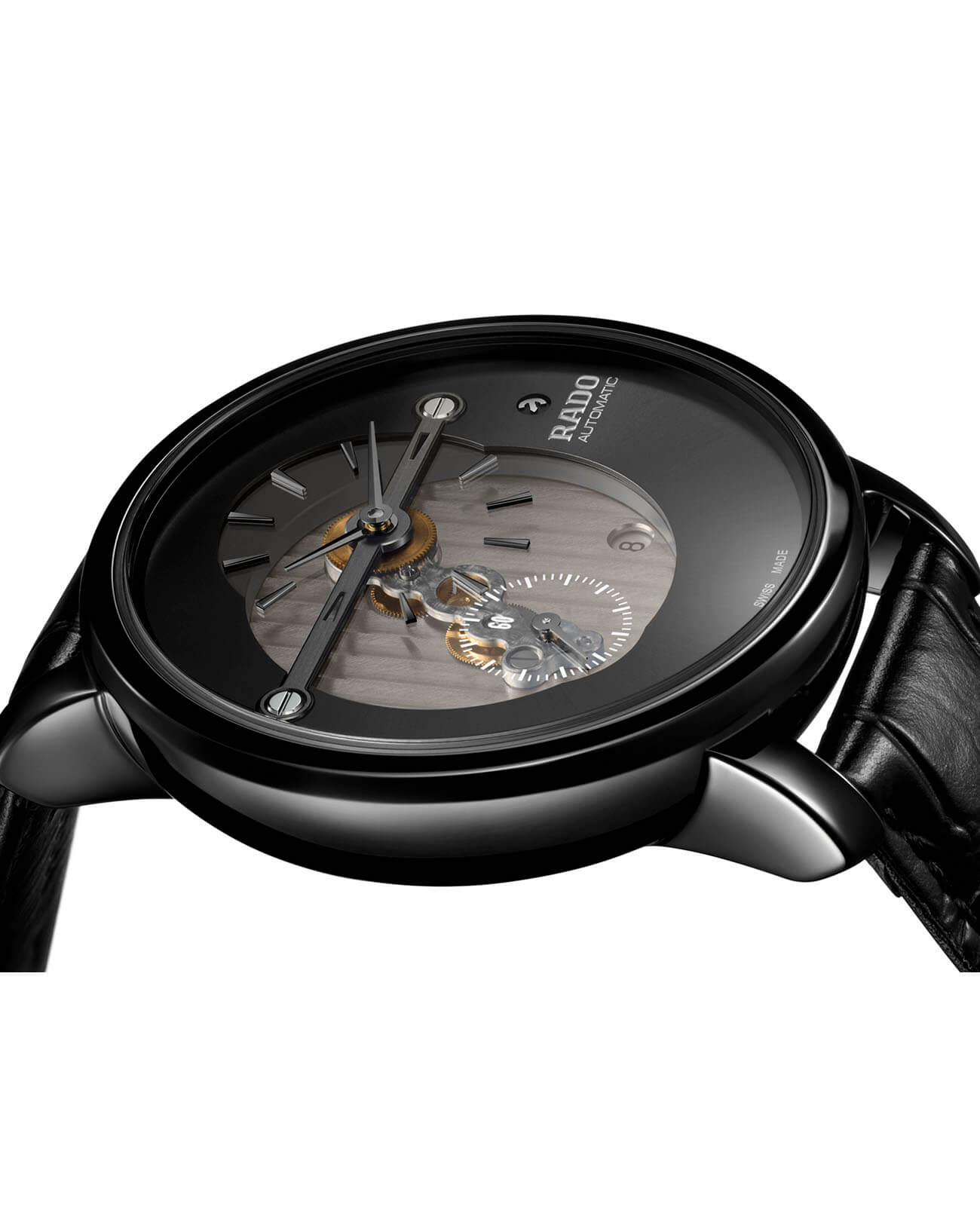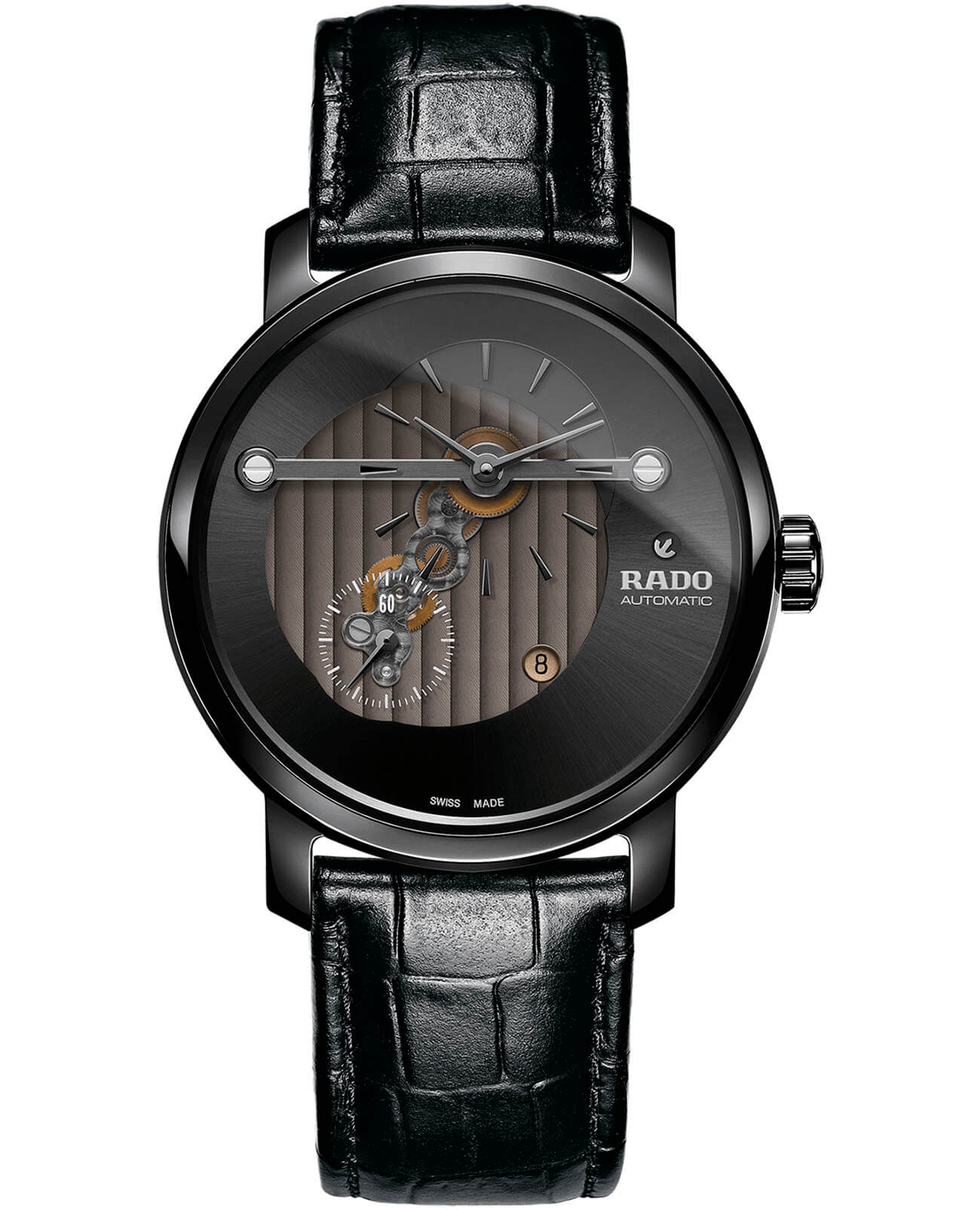Оригинальный циферблат называют совершенством линий и лаконичности, необычное исполнение которого никого не оставляет равнодушным. Индикация времени занимает не всё пространство, секундный счётчик вынесен отдельно, серединка оставлена прозрачной. Наручные часы оснащаются автоматическим механизмом ETA 2899-S2 с запасом хода 42 часа, украшенным традиционным узором «женевские волны». Скелетонизированная задняя крышка. Антибликовое покрытие сапфирового стекла. Корпус и безельБезельВнешний ободок, закрепляющий стекло. В спортивных часах так называется поворотное кольцо с делениями на циферблате, выполняет роль таймера – замеряет отрезки времени на шкале. Неподвижный безель – элемент декора. Однонаправленно вращающийся безель на дайверских часах позволяет фиксировать моменты погружения и выныривания на поверхность. из высокотехнологичной керамикиВысокотехнологичная керамикаИнновационный запатентованный Rado материал с гладкой или матовой поверхностью. Керамика за счёт кристаллической структуры обладает повышенной устойчивостью от возникновения царапин. Материал способен принимать температуру тела человека, обеспечивая невероятный комфорт при ношении.. Ремешок из натуральной кожи. Апертура даты. Диаметр корпуса: 43 мм.