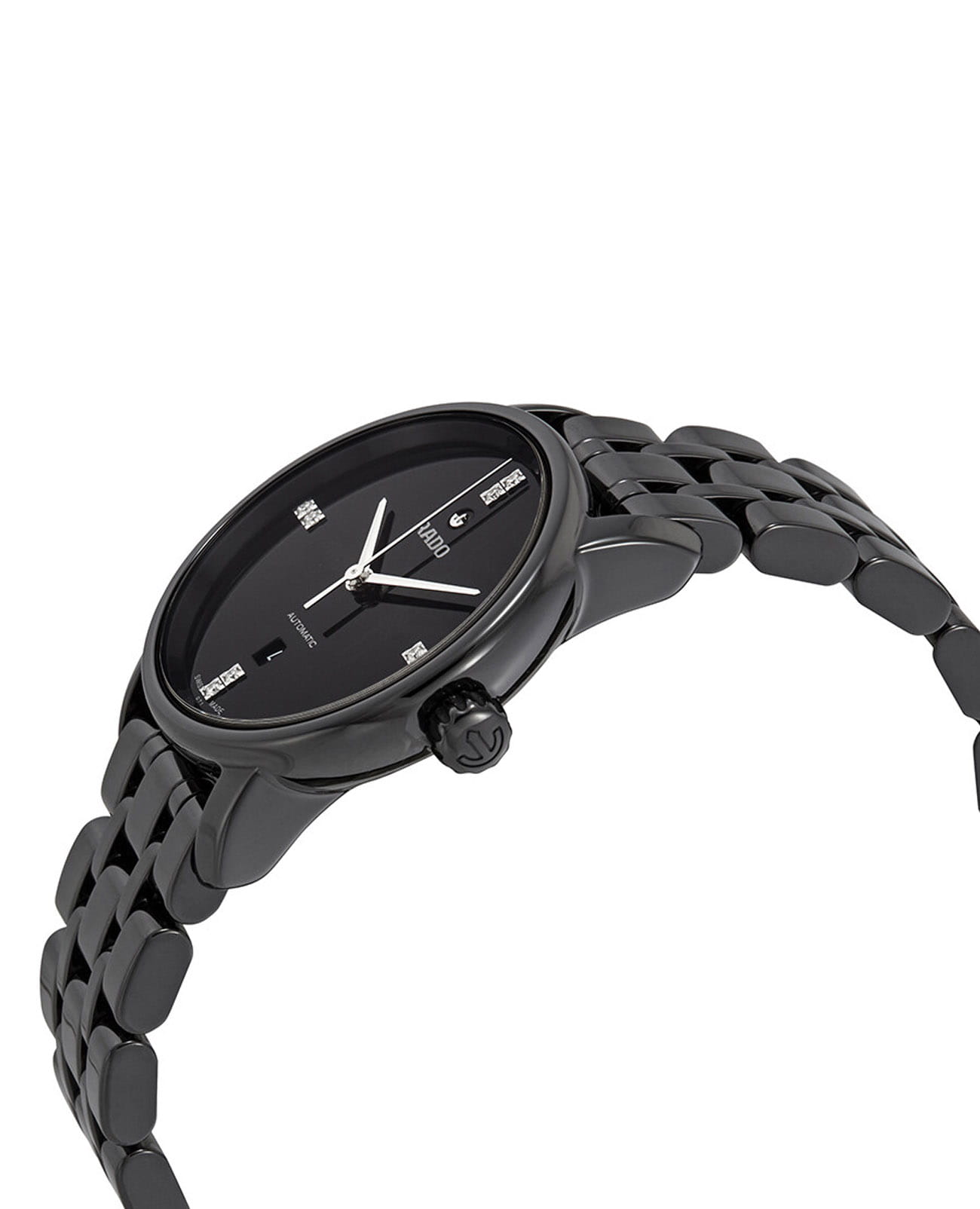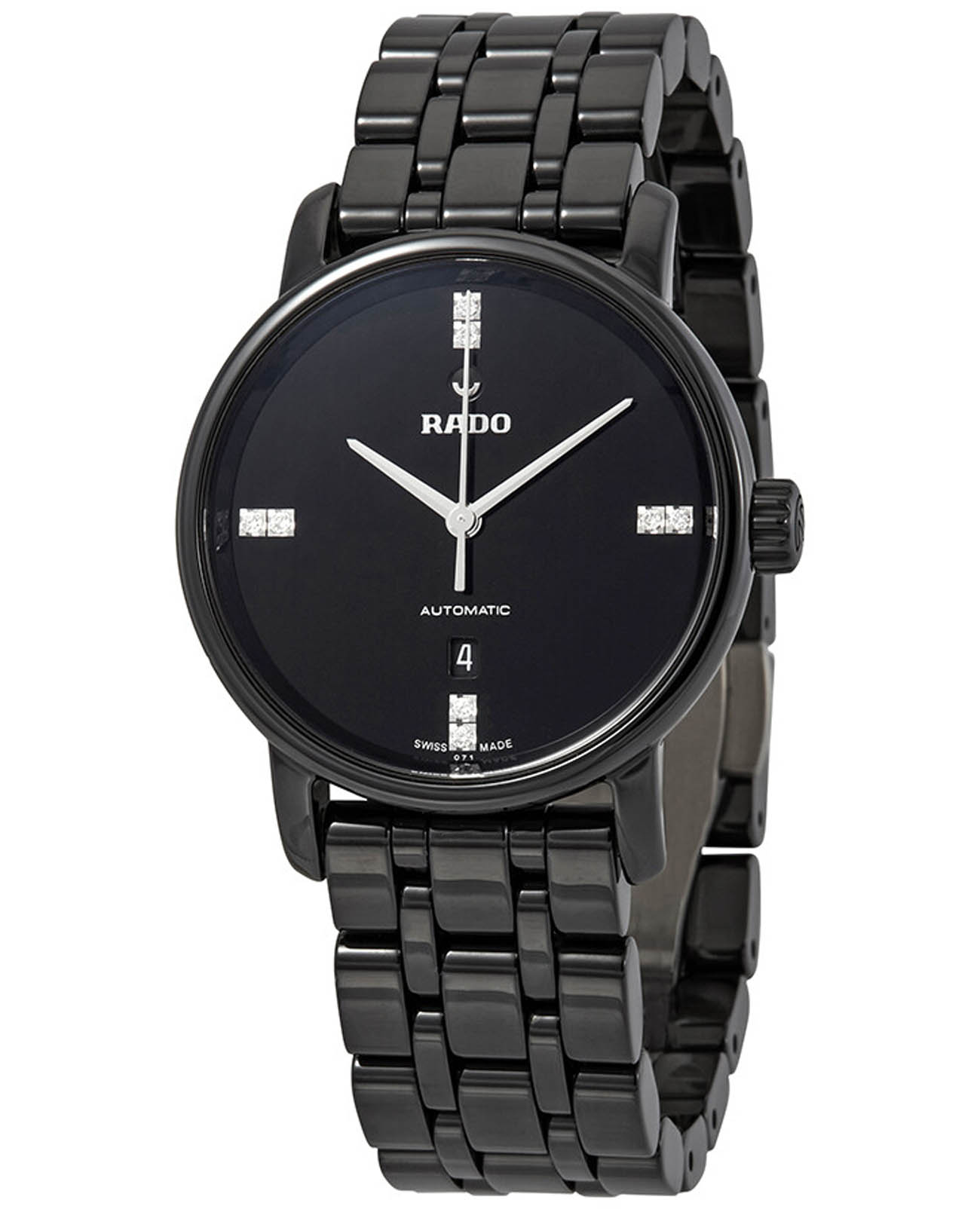 Женские швейцарские механические часы с автоподзаводом Rado Diamaster R14043717. Сапфировое стеклоСапфировое стеклоПрочный и надёжный материал из кристалла сапфира синтетического происхождения, характеризующийся особой твёрдостью и устойчивостью к царапинам и повреждениям. устойчивое к мелким механическим повреждениям. Корпус часов изготовлен из титана и высокотехнологичной керамикиВысокотехнологичная керамикаИнновационный запатентованный Rado материал с гладкой или матовой поверхностью. Керамика за счёт кристаллической структуры обладает повышенной устойчивостью от возникновения царапин. Материал способен принимать температуру тела человека, обеспечивая невероятный комфорт при ношении.. Окошко даты находится в положении 6 часов. Циферблат укаршен бриллиантами. Класс водозащиты: 50 метров, позволит защитить корпус от случайных брызг или капель дождя. Браслет из титана и высокотехнологичной керамикиВысокотехнологичная керамикаИнновационный запатентованный Rado материал с гладкой или матовой поверхностью. Керамика за счёт кристаллической структуры обладает повышенной устойчивостью от возникновения царапин. Материал способен принимать температуру тела человека, обеспечивая невероятный комфорт при ношении. на раскладной застёжкеРаскладная застёжкаТакой тип застёжки используется только на браслетах из металла. Она никогда не раскрывается полностью, происходит разделение на 2 и более частей. Раскладывающая застёжка снизит вероятность потери часов к минимуму..