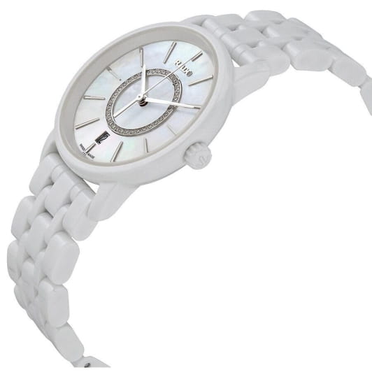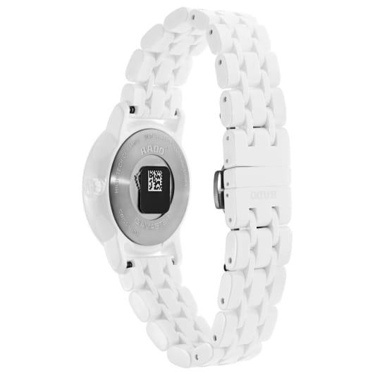 Женские швейцарские часы Rado Coupole R14065907. Корпус и браслет часов изготовлены из высокотехнологичной плазменной керамикиВысокотехнологичная плазменная керамикаИнновационный материал, технология запатентована. Выплавление керамики осуществляется в печи при 20 000 °C, белоснежный материал под воздействием ультравысокой температуры приобретает уникальный блеск, присущий металлам.. Сапфировое стеклоСапфировое стеклоПрочный и надёжный материал из кристалла сапфира синтетического происхождения, характеризующийся особой твёрдостью и устойчивостью к царапинам и повреждениям. устойчивое к мелким механическим повреждениям. Браслет на застёжке «бабочке» с кнопкамиЗастёжка "бабочка"Такой вид застёжки дополняется предохранителями, помогающими избежать случайного раскрытия браслета. Обладают изящным исполнением. . Класс водозащиты: 50 метров, позволит защитить корпус от случайных брызг или капель дождя. Циферблат украшен бриллиантами. Отображение даты в положении «6 часов».