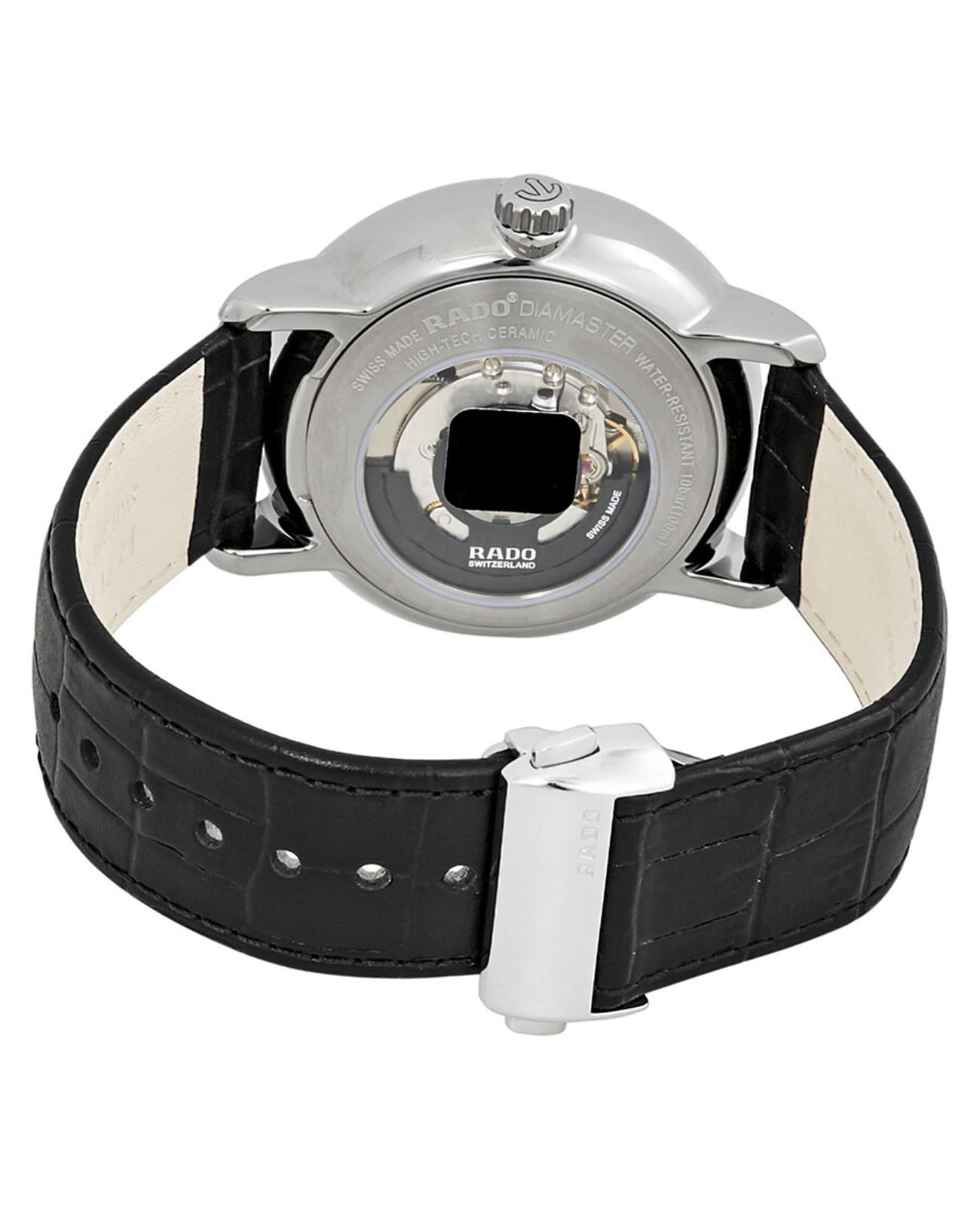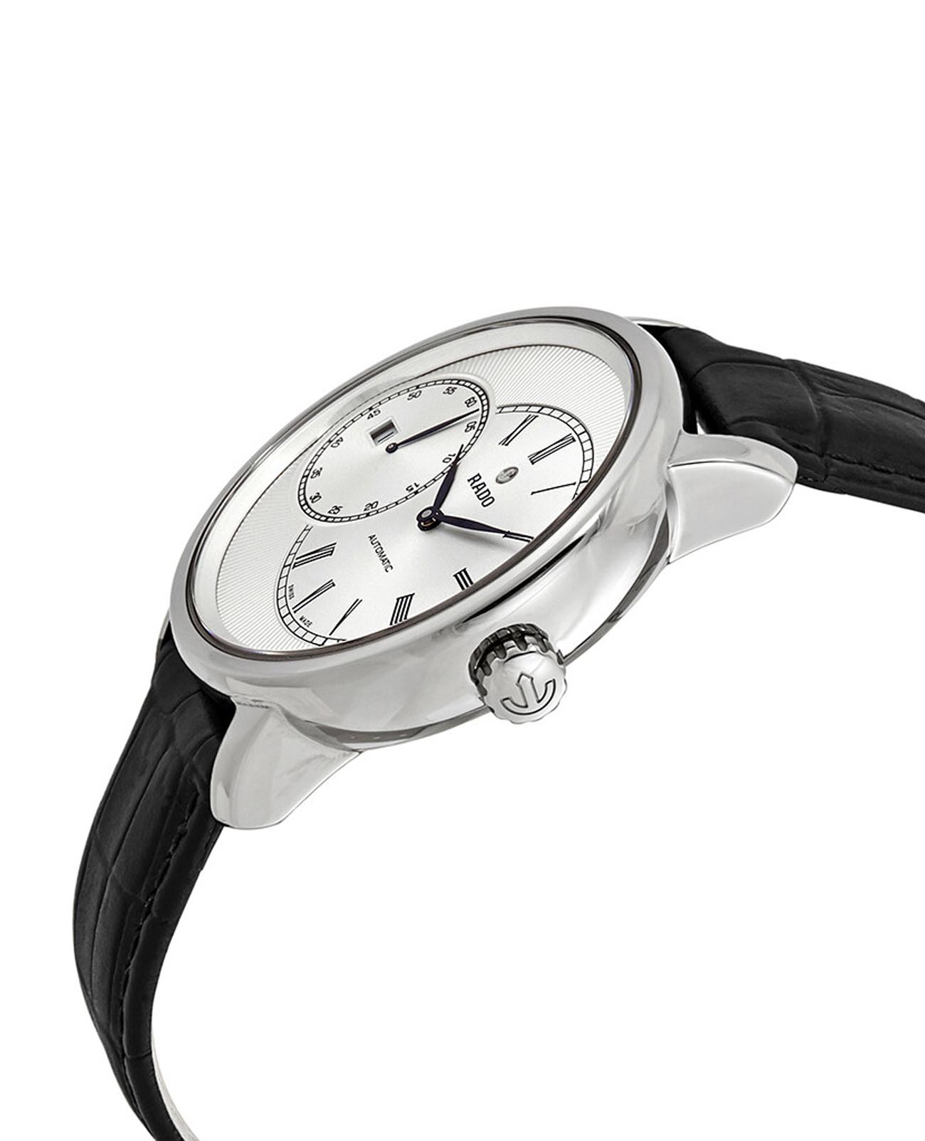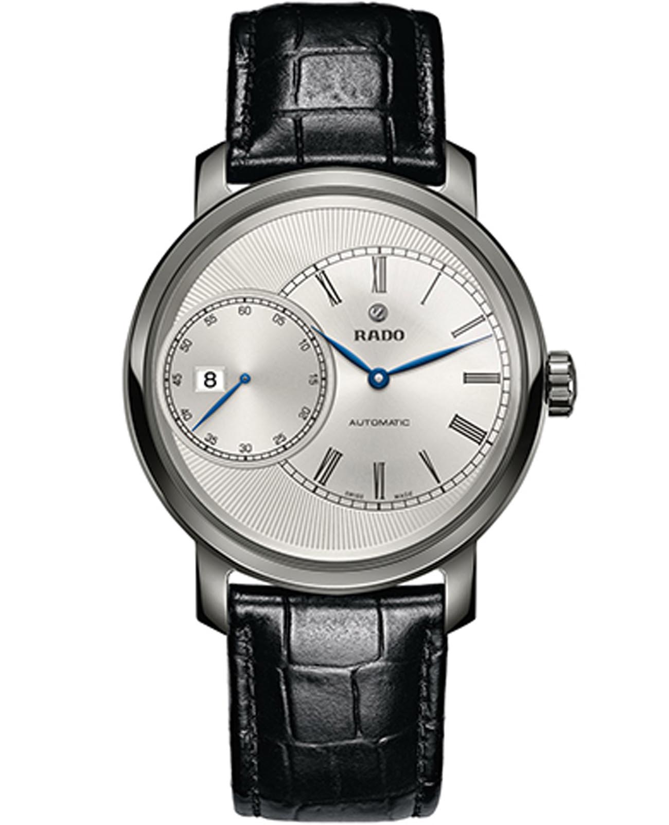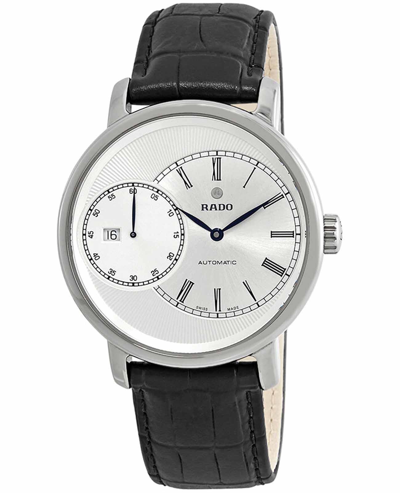 Мужские механические швейцарские часы с автоподзаводом Rado Diamaster Automati Grande Seconde R14129136. Сапфировое стеклоСапфировое стеклоПрочный и надёжный материал из кристалла сапфира синтетического происхождения, характеризующийся особой твёрдостью и устойчивостью к царапинам и повреждениям. устойчивое к мелким механическим повреждениям. Корпус часов изготовлен из нержавеющей стали. Окошко даты находится в положении 9 часов. Класс водозащиты: 100 метров, позволит плавать, нырять и заниматься другими водными видами спорта. Кожаный ремешок на раскладной застёжкеРаскладная застёжкаТакой тип застёжки используется только на браслетах из металла. Она никогда не раскрывается полностью, происходит разделение на 2 и более частей. Раскладывающая застёжка снизит вероятность потери часов к минимуму..