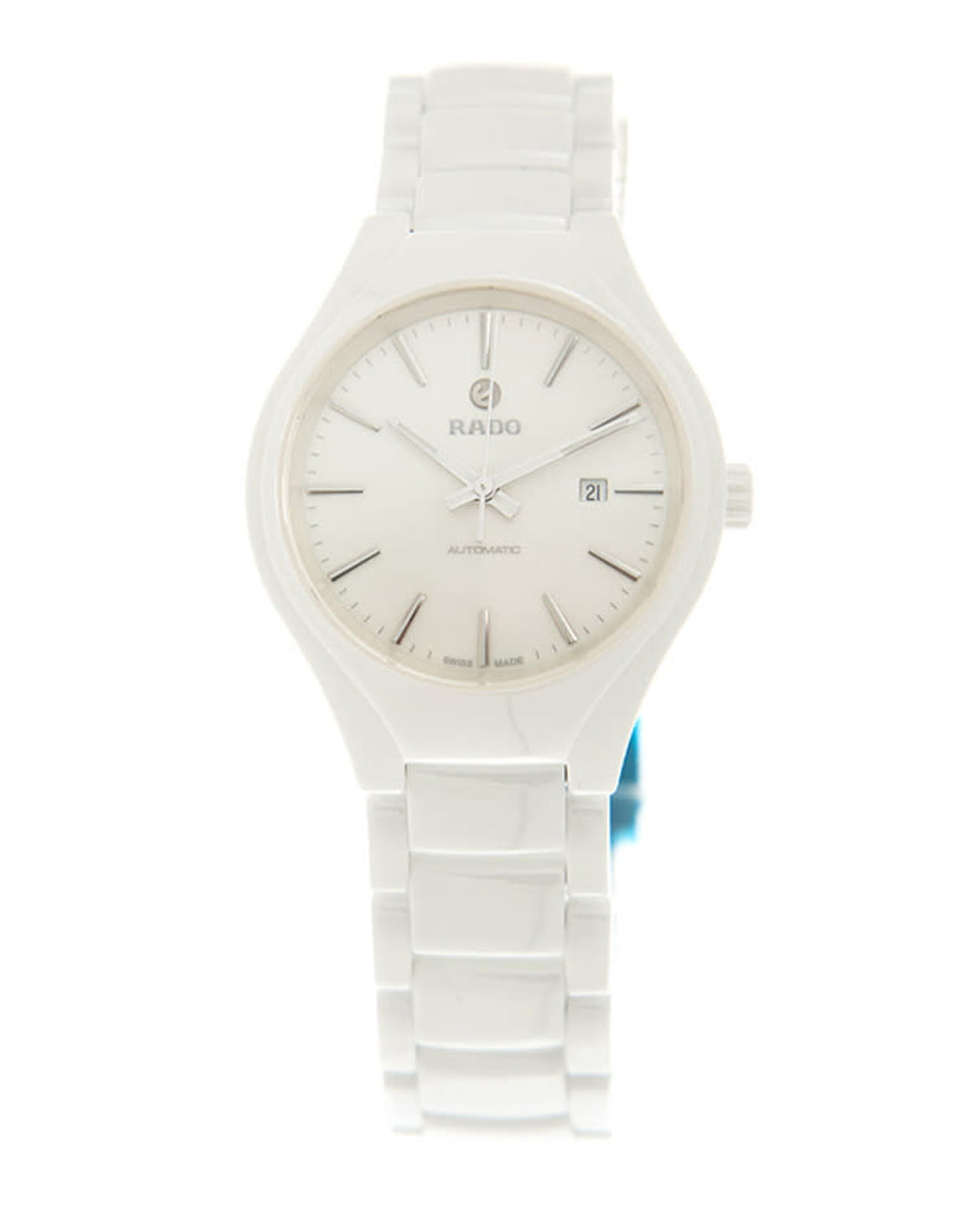 Женские механические швейцарские часы с автоподзаводом Rado True R27244012. Сапфировое стеклоСапфировое стеклоПрочный и надёжный материал из кристалла сапфира синтетического происхождения, характеризующийся особой твёрдостью и устойчивостью к царапинам и повреждениям. устойчивое к появлению царапин, обладающее высокой прозрачностью. Корпус часов изготовлен из высокотехнологичной керамикиВысокотехнологичная керамикаИнновационный запатентованный Rado материал с гладкой или матовой поверхностью. Керамика за счёт кристаллической структуры обладает повышенной устойчивостью от возникновения царапин. Материал способен принимать температуру тела человека, обеспечивая невероятный комфорт при ношении.. Окошко даты находится в положении 3 часа. Стрелки с люминесцентным покрытиемЛюминесцентное покрытиеПозволяет считывать показания времени в темноте. Производители наносят на стрелки, часовые индексы, безель или поверхность циферблата светонакопительный состав, дающий холодное свечение.. Класс водозащиты: 30 метров, позволит защитить корпус от случайных брызг или капель дождя. Браслет из высокотехнологичной плазменной керамикиВысокотехнологичная плазменная керамикаИнновационный материал, технология запатентована. Выплавление керамики осуществляется в печи при 20 000 °C, белоснежный материал под воздействием ультравысокой температуры приобретает уникальный блеск, присущий металлам. на застёжке «бабочка» с кнопкамиЗастёжка "бабочка"Такой вид застёжки дополняется предохранителями, помогающими избежать случайного раскрытия браслета. Обладают изящным исполнением. .