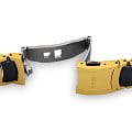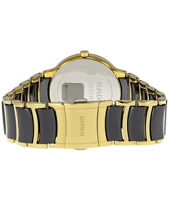 Традиционный круглый циферблат чёрного цвета с золотистыми стрелками и метками имеет узор «солнечные лучи», лаконичное исполнение делает аксессуар универсальным вариантом для любого события. Корпус и браслет выполнены из хирургической стали 316L, браслет сделан в сочетании с высокотехнологичной керамикойВысокотехнологичная керамикаИнновационный запатентованный Rado материал с гладкой или матовой поверхностью. Керамика за счёт кристаллической структуры обладает повышенной устойчивостью от возникновения царапин. Материал способен принимать температуру тела человека, обеспечивая невероятный комфорт при ношении.. В основе работы находится кварцевый механизм ETA 955.112 с высокой точностью хода. Сапфировое стекло устойчиво к образованию царапин на поверхности. Сохранение водонепроницаемости при давлении до 3 бар. PVD-покрытиеPVDУльтратонкое покрытие наносится в технике вакуумного напыления, сочетает в себе нитрид титана особой прочности со слоем золота или оксида хрома. Несёт в себе декоративную или защитную функцию. цвета «жёлтое золото». Отображение даты. Диаметр корпуса: 38 мм.