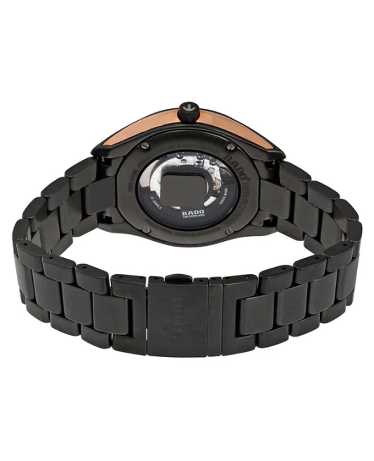 Мужские механические швейцарские часы с автоподзаводом Rado Hyperchrome R32023152. Сапфировое стеклоСапфировое стеклоПрочный и надёжный материал из кристалла сапфира синтетического происхождения, характеризующийся особой твёрдостью и устойчивостью к царапинам и повреждениям. устойчивое к мелким механическим повреждениям. Корпус часов изготовлен из нержавеющей стали с PVD-покрытиемPVDУльтратонкое покрытие наносится в технике вакуумного напыления, сочетает в себе нитрид титана особой прочности со слоем золота или оксида хрома. Несёт в себе декоративную или защитную функцию.. БезельБезельВнешний ободок, закрепляющий стекло. В спортивных часах так называется поворотное кольцо с делениями на циферблате, выполняет роль таймера – замеряет отрезки времени на шкале. Неподвижный безель – элемент декора. Однонаправленно вращающийся безель на дайверских часах позволяет фиксировать моменты погружения и выныривания на поверхность. из высокотехнологичной керамикиВысокотехнологичная керамикаИнновационный запатентованный Rado материал с гладкой или матовой поверхностью. Керамика за счёт кристаллической структуры обладает повышенной устойчивостью от возникновения царапин. Материал способен принимать температуру тела человека, обеспечивая невероятный комфорт при ношении.. Окошко даты находится в положении 3 часа. Стрелки с люминесцентным покрытиемЛюминесцентное покрытиеПозволяет считывать показания времени в темноте. Производители наносят на стрелки, часовые индексы, безель или поверхность циферблата светонакопительный состав, дающий холодное свечение.. Класс водозащиты: 100 метров, позволит плавать, нырять и заниматься другими водными видами спорта. Браслет из высокотехнологичной керамикиВысокотехнологичная керамикаИнновационный запатентованный Rado материал с гладкой или матовой поверхностью. Керамика за счёт кристаллической структуры обладает повышенной устойчивостью от возникновения царапин. Материал способен принимать температуру тела человека, обеспечивая невероятный комфорт при ношении. на раскладной застёжкеРаскладная застёжкаТакой тип застёжки используется только на браслетах из металла. Она никогда не раскрывается полностью, происходит разделение на 2 и более частей. Раскладывающая застёжка снизит вероятность потери часов к минимуму..